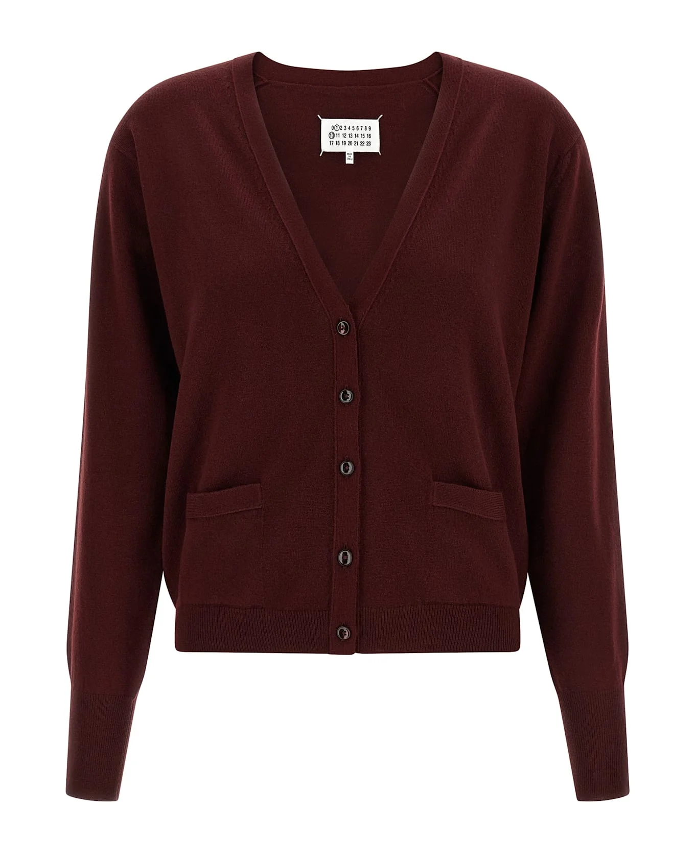 Virgin wool cardigan with V-neck, front button closure, pockets, long cuffed sleeves, back 'Four Stitches', headband. Composition: 100% virgin wool Made in: Italy Color: Bordeaux Size and fit: - true to size fit Model number: S51HP0026M13225211