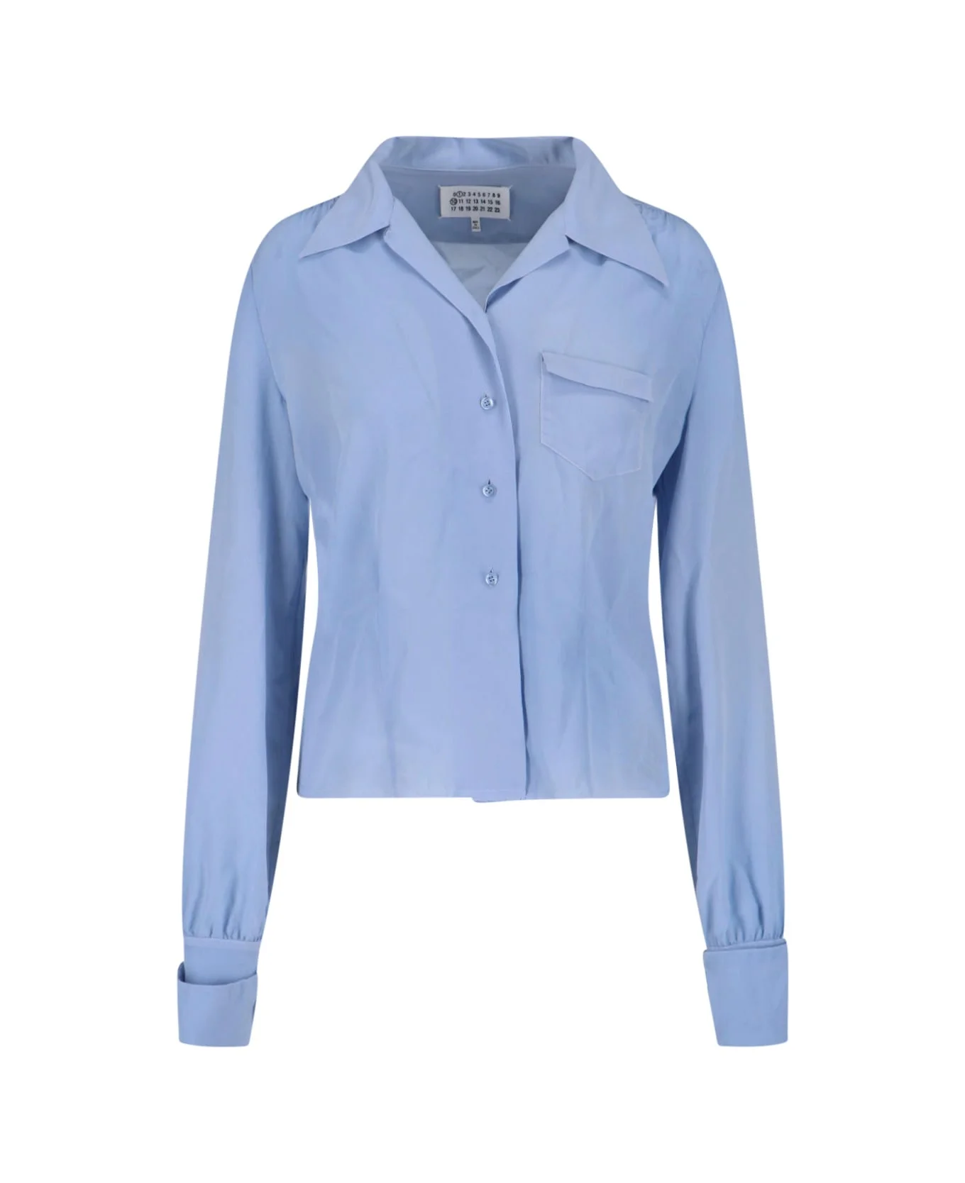 Maison Margiela 'Four Stitches' light blue silk shirt with wide collar, button closure, front pocket, 'four stitches' logo embroidery at the back, back pleated detail, button cuffs, straight hem. Composition: 100% Silk Made in: Italy Color: Light Blue Size and fit: - Vestibilita regolare Model number: S51DT0028M35704479