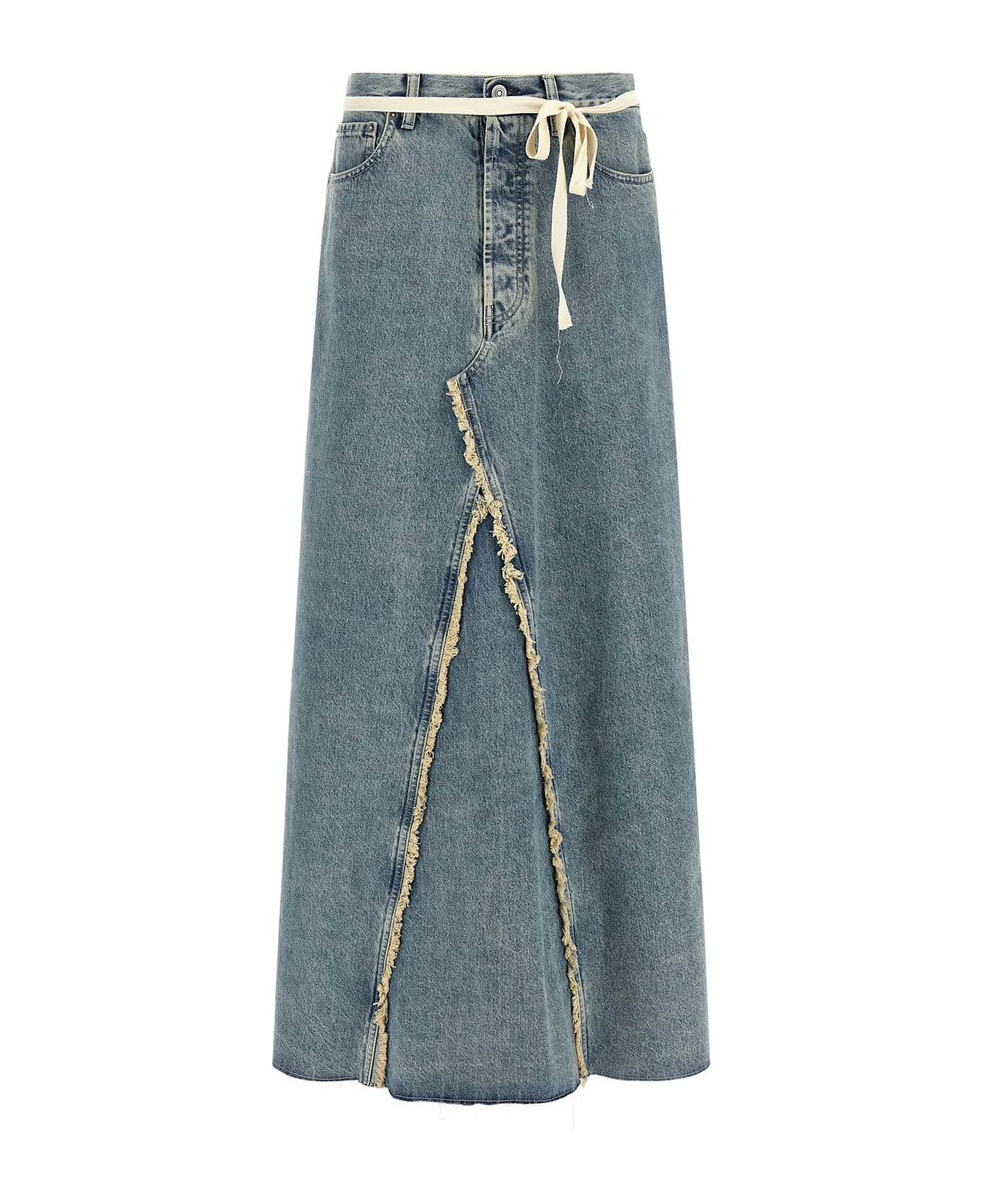 Long skirt in stone-washed cotton denim, raw cut hem with frayed edges, flared silhouette, wallet style with contrast grosgrain lace to tie as desired and open back, pockets, front button closure, five pockets, 'Four Stitches' at the back. Composition: 100% cotton Made in: Italy Color: Light Blue Size and fit: - true to size fit Model number: S29MI0010M30066962