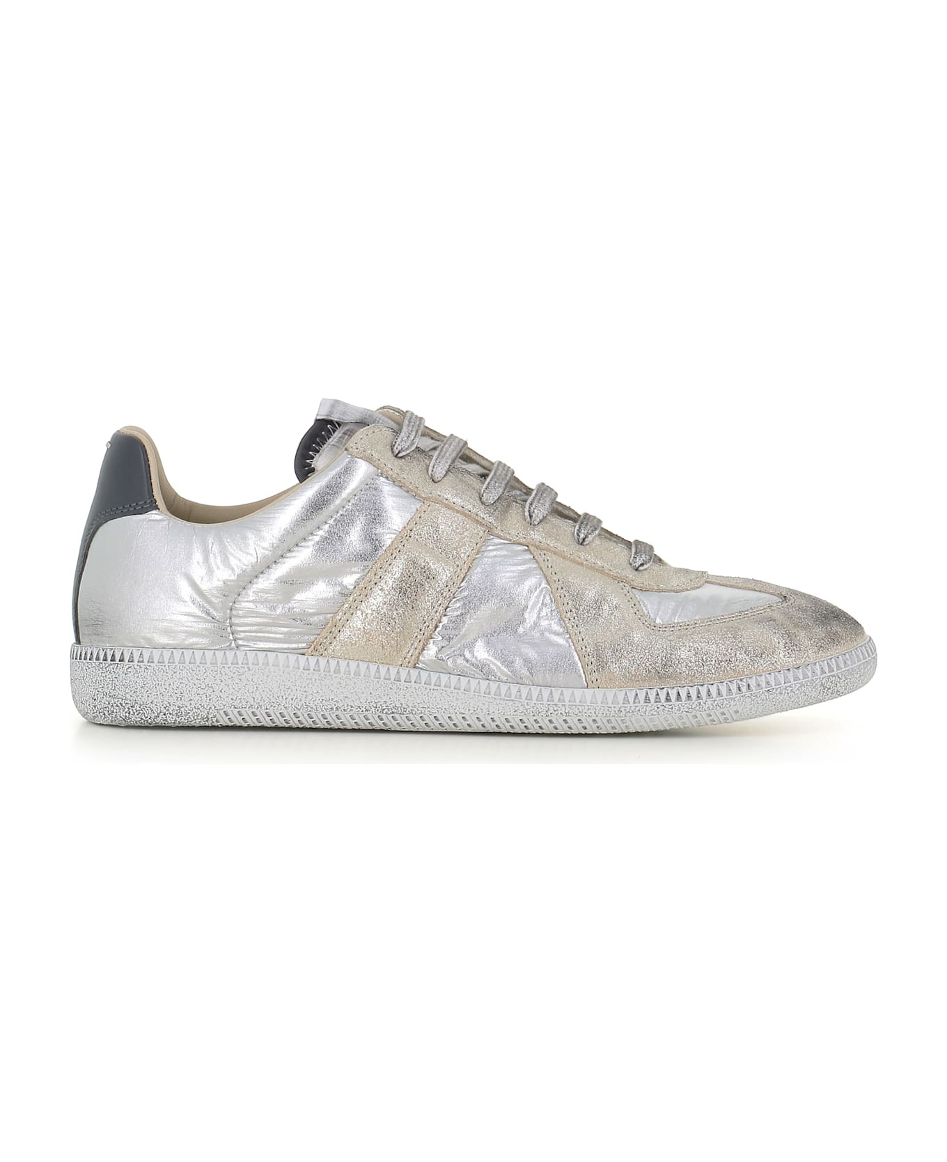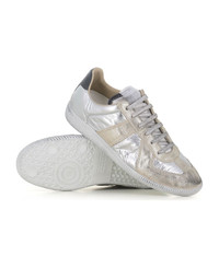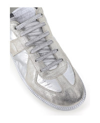 Silver leather men's trainers by Maison Margiela, featuring gold inserts, front lace-up fastening, flat rubber sole and single-stitch logo. Lined interior. Heel: 2,5 cm Composition: Leather Made in: Italy Color: Silver Size and fit: - Fits true to the size. Model number: S97WS0083/P7451HB123