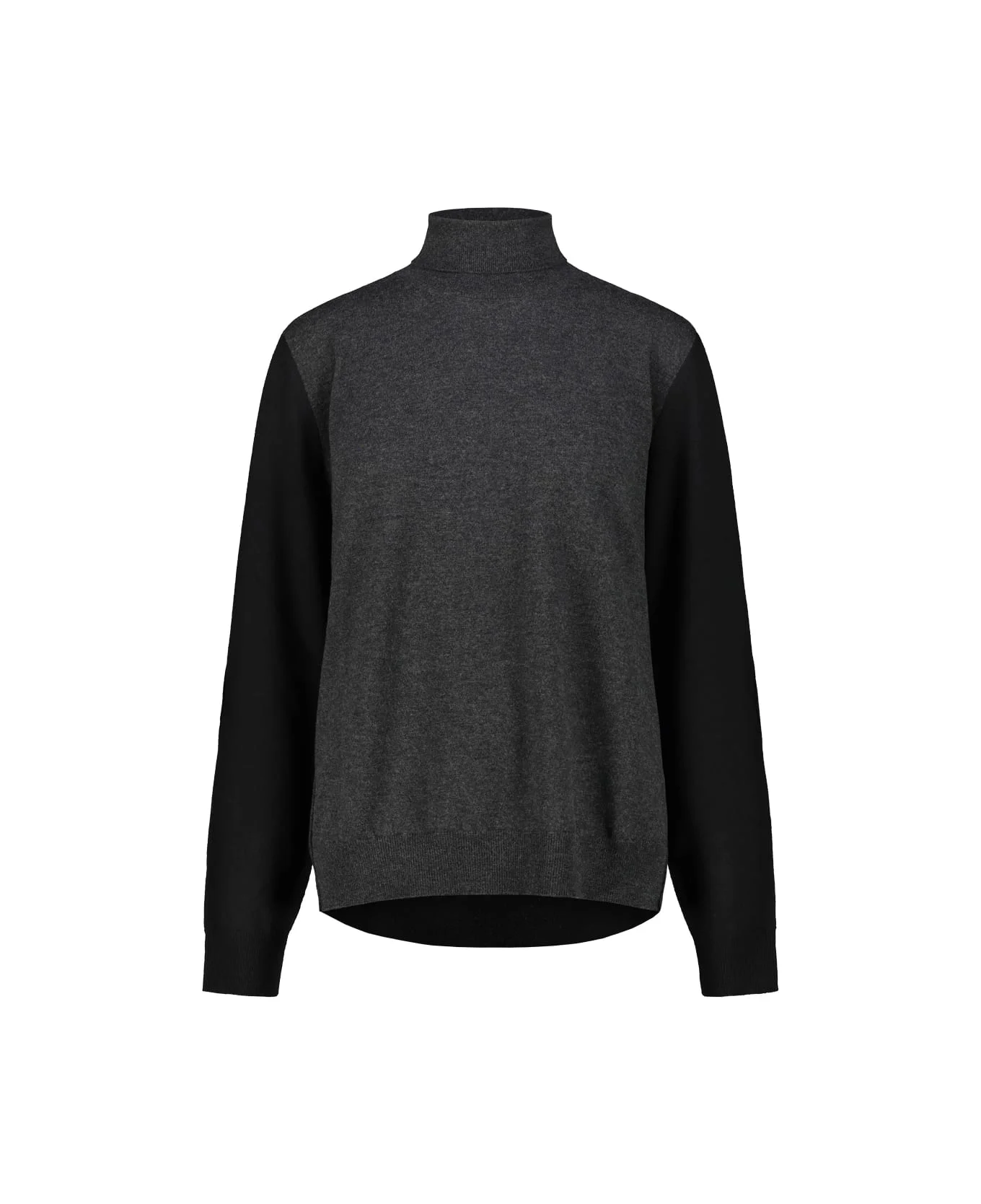 Maison Margiela turtleneck sweater with grey front and black back and sleeves with suede elbow patches. GTIN code: S67HL0012 M13177 001F Made in: Italy Color: F Gray Black Model number: S67HL0012M13177