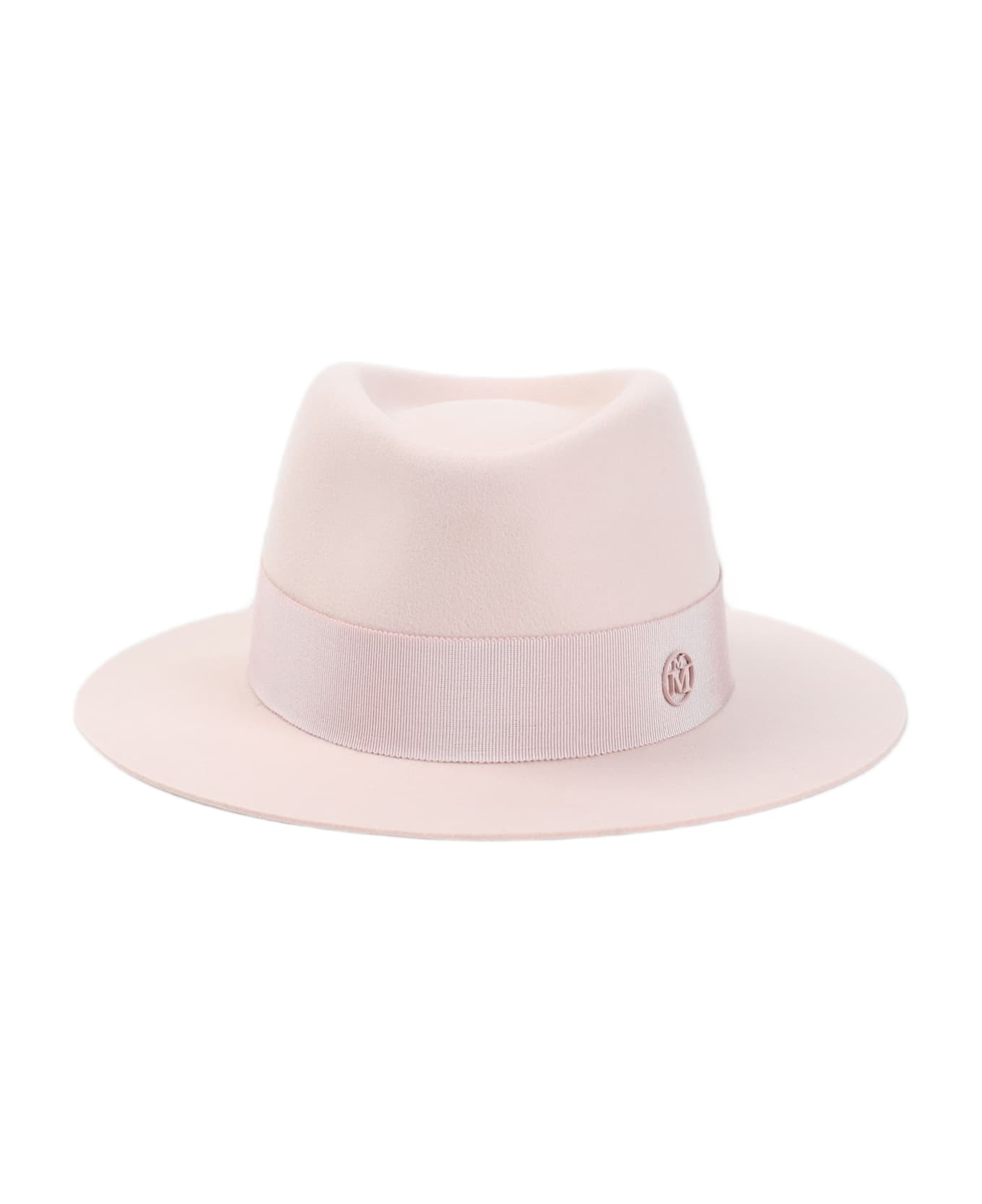 Maison Michel Andre Pink Wool Felt Hat. Crafted from pink felted wool, fedora design, tonal grosgrain band with tonal logo plaque detail, pinched crown, pull-on style. Made in: France Color: Baby Pink Model number: 1003176002BABY