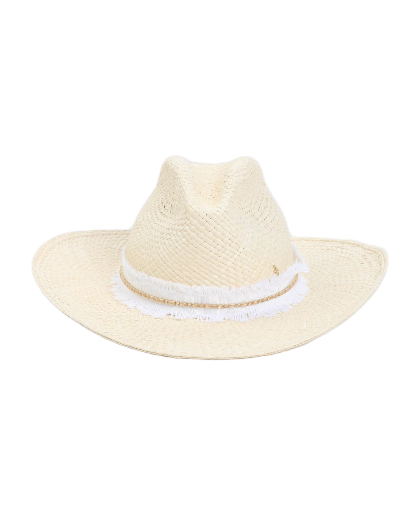 Maison Michel Natural Beige Brisa Austin Denim Strass Hat. Pure natural beige brisa, wide-brimmed design, contrasting white fringed strap, gold crystal details, side gold-tone metallic logo. Made in: Italy Color: Natural Model number: 1036039001NATURAL