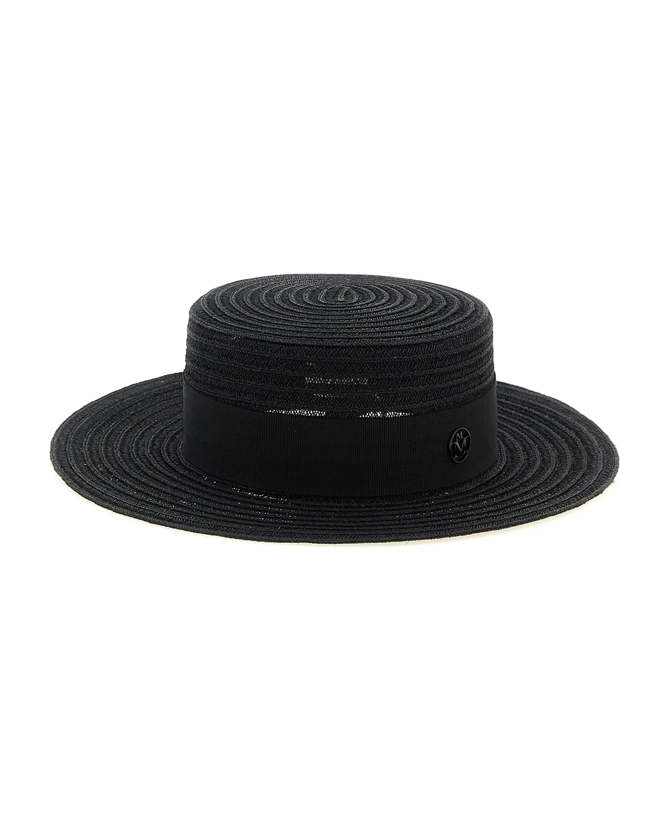 Kiki' straw hat, canotier style with grosgrain ribbon and tone-on-tone metal logo. 'The Iconics' collection. Handcrafted product, any imperfections are to be considered characteristics of uniqueness. Composition: 100% hemp Made in: Italy Color: Black Size and fit: - true to size fit Model number: 1041018001BLACK