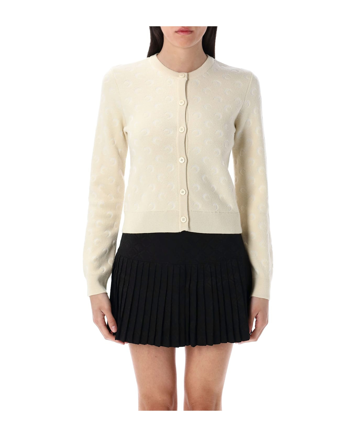 Wool Blend Moon Jacquard Knit Fitted Cardigan By Marine Serre. Featuring: Crew Neck Long Sleeves Buttons Closure Allover Moon Jacquard Motif Rib Trims Fitted Silhouette Model Is 1,70 M And Wears Size S Composition: 50% virgin wool, 50% viscose Made in: Bulgaria Color: OFF WHITE Model number: WTK011ACKNI0530WH20