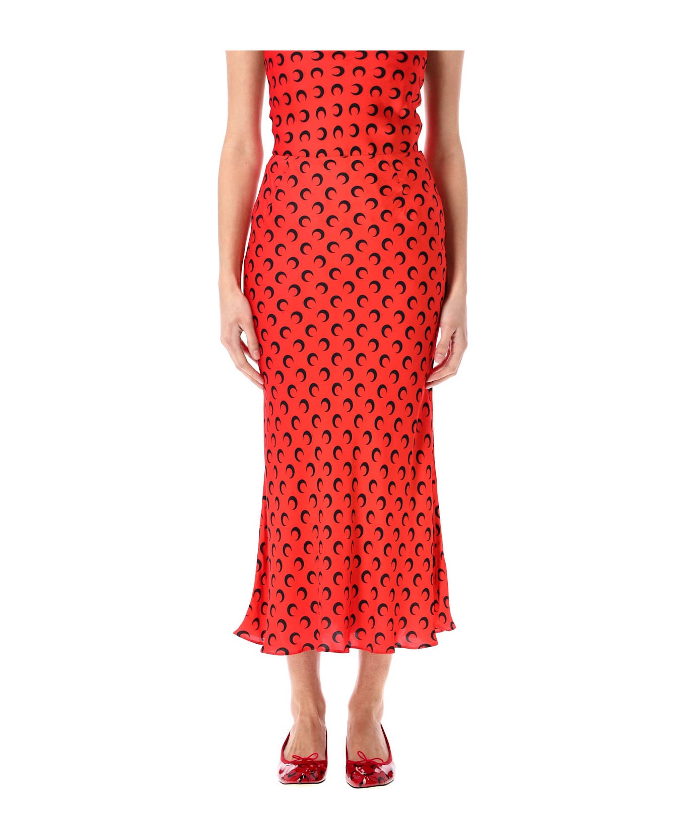 Moon Satin Midi Skirt By Marine Serre. Featuring: Allover Moon Printed Satin Side Zip Closure Flared Hem Model Is 1,70 M And Wears Size 36 Composition: 100% viscose Made in: Romania Color: RED Model number: WSK070ACWOV0060RD10
