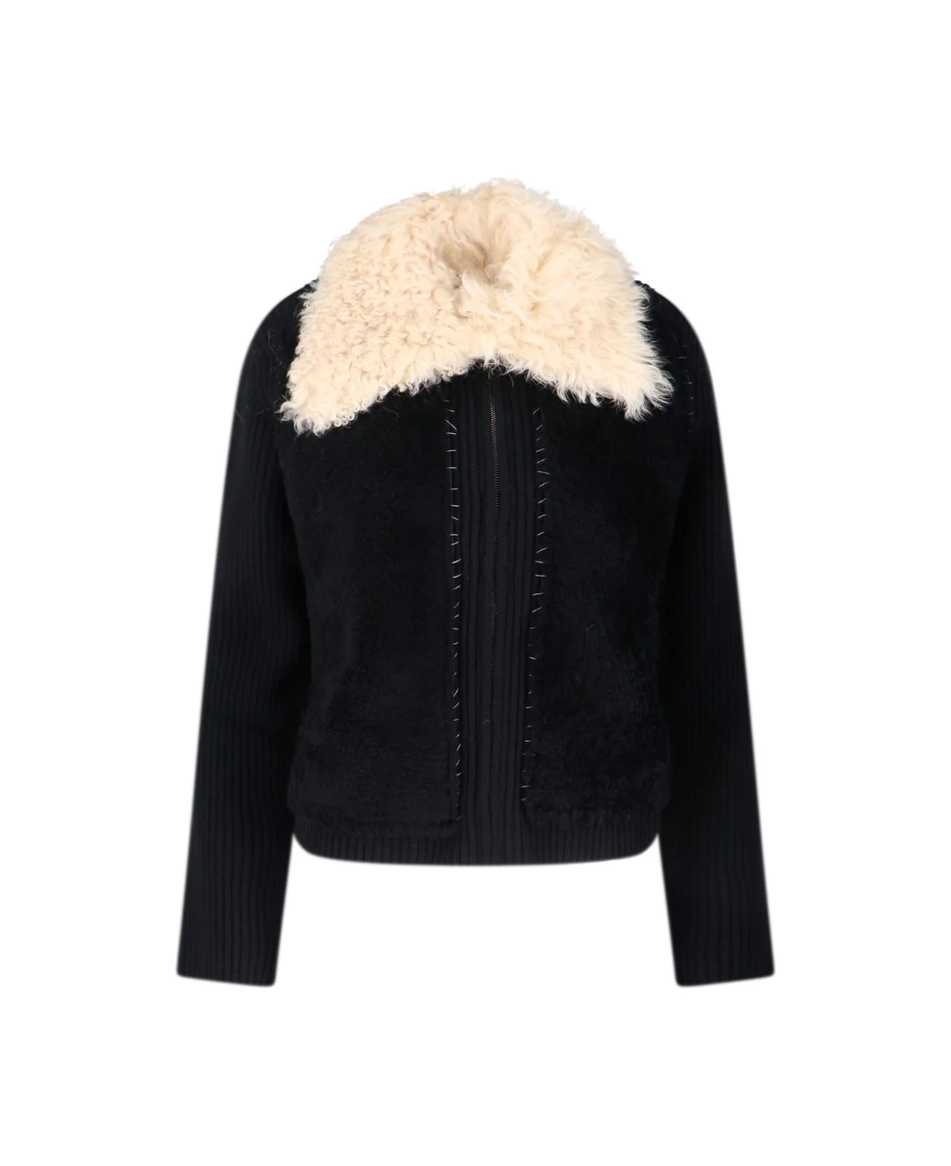 BLACK WOOL CARDIGAN WITH SHEARLING PATCHES