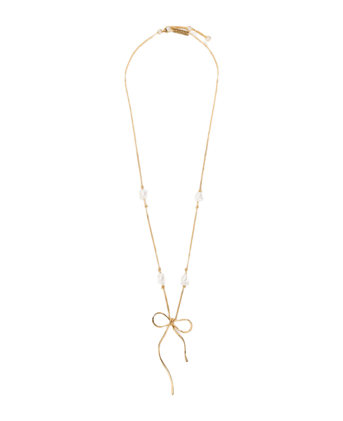 Marni Gold Brass and Pearl Necklace. Crafted from golden-toned brass, chain adorned with pearls, bow-shaped charm, lobster clasp, adjustable fit. Made in: Italy Color: Gold Model number: COMV0526A0M200100Y65