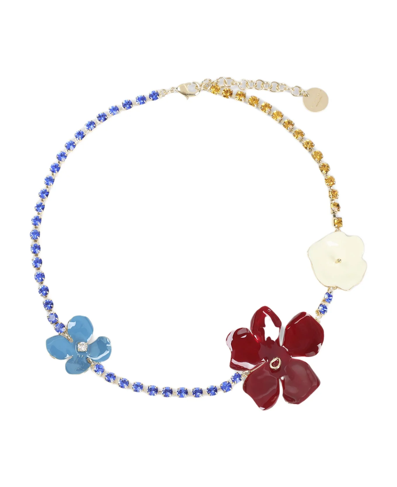 Marni Flower Burgundy Brass Necklace. Two-toned rhinestone chain necklace, featuring hand-enameled white, burgundy, and light-blue floral charms, finished with an adjustable lobster-clasp fastening. Made in: Italy Color: Burgundy Model number: COMV0581A0P652700R79