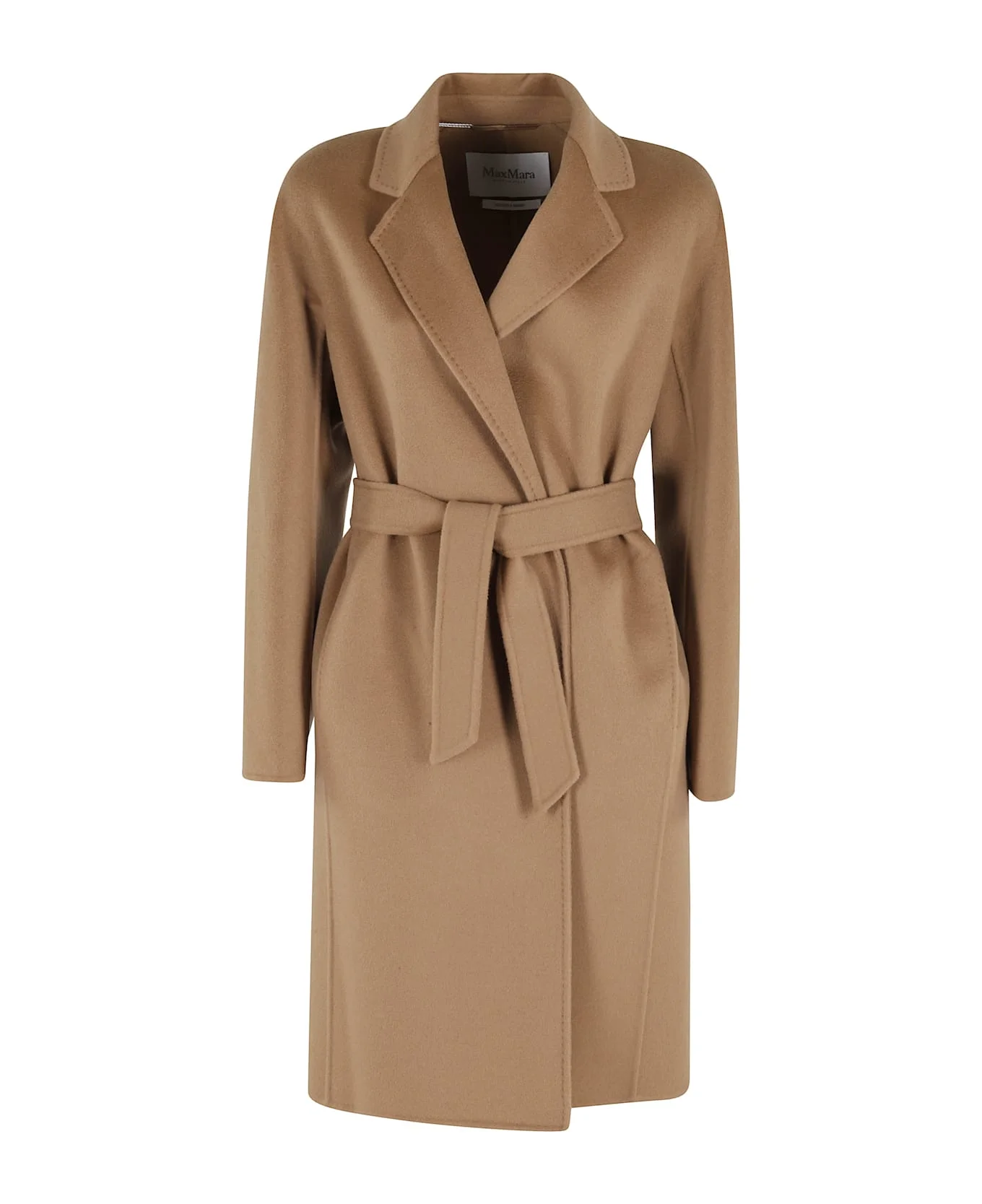 Category: Coat Item: Maple Coat Brand: Max Mara Color: Camel Neckline: V-neck lapel Pockets: Two welt pockets Details: Waist with adjustable belt, with loops SIZE AND FIT Fit: Regular Cut: Straight Sleeve length: Long Made in: European Union Color: Cammello Model number: 2611011101600|098003