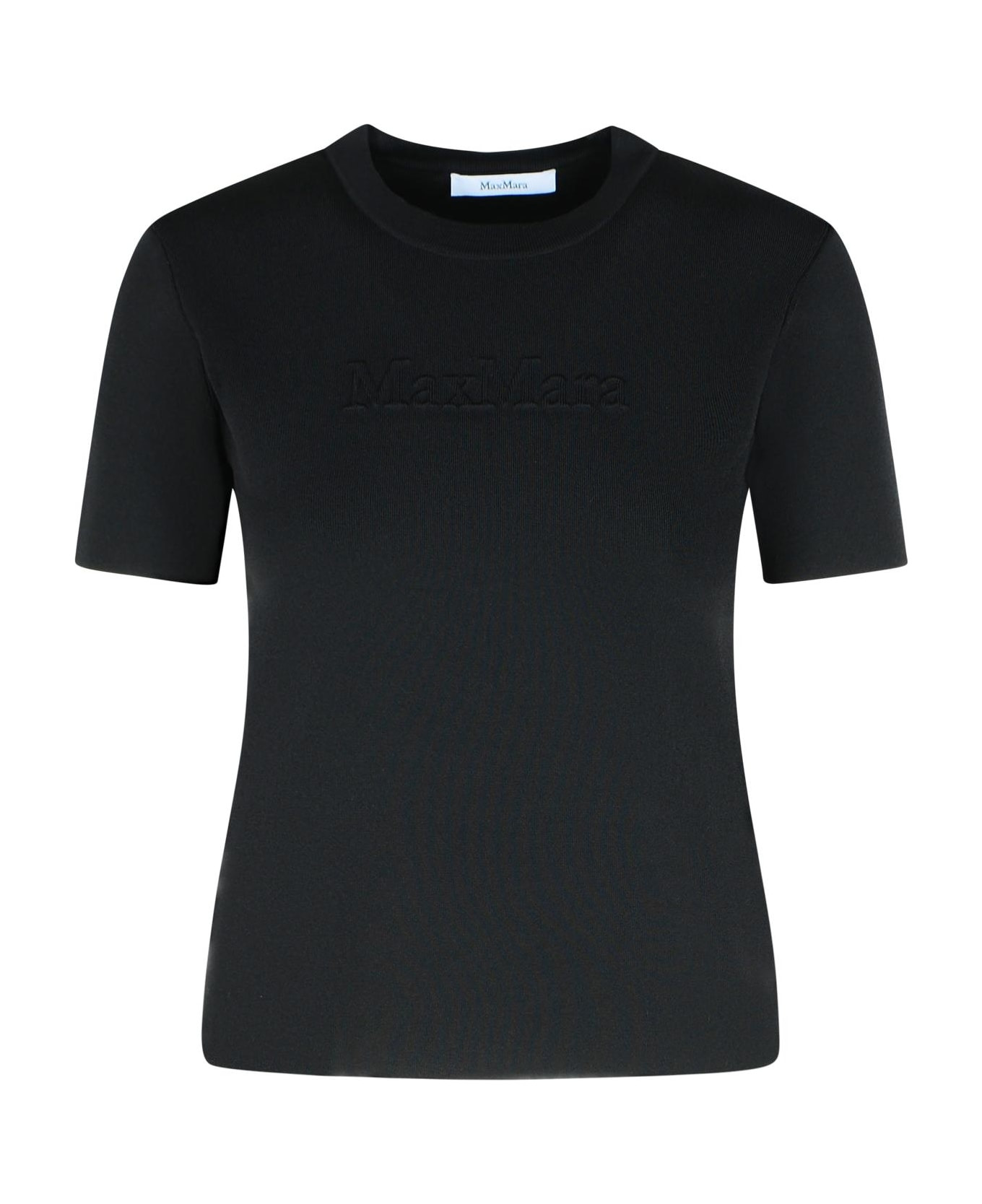 'crepe' viscose yarn sweater, semi-tight fit, ribbed crewneck, short sleeves around Composition: 65% viscose, 35% nylon Made in: Italy Color: Black Model number: 21366068600005