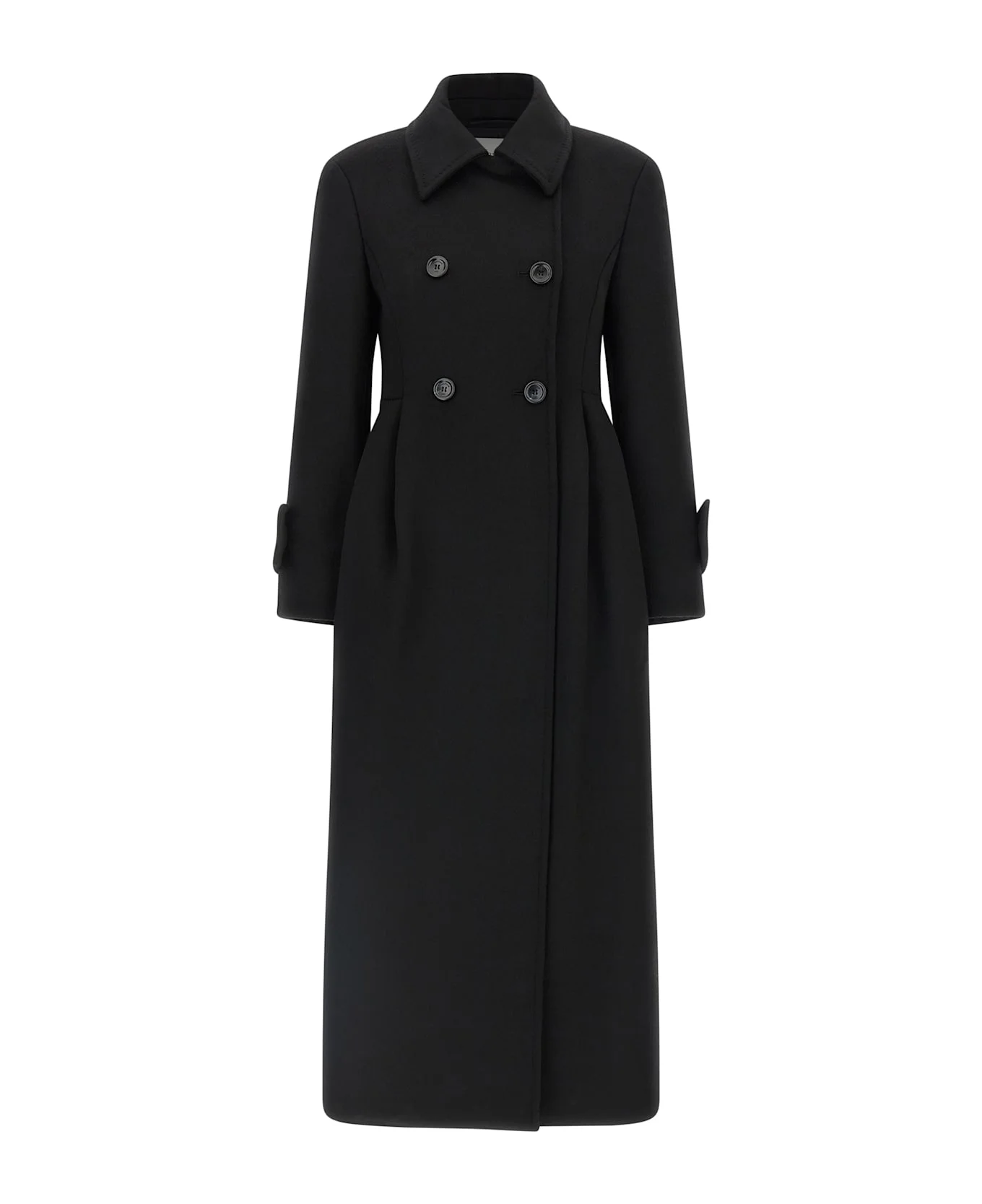 'Beati1234' long coat in double drap of baby camel, double-breasted model with front button closure, hourglass silhouette with pincer at the waist, shirt collar, pockets, structured and padded shoulder strap, long sleeves, kissed pleat at the back. Composition: 100% camel wool (Camelus dromedarius) Made in: Italy Color: Black Size and fit: - true to size fit Model number: 2521016483600003