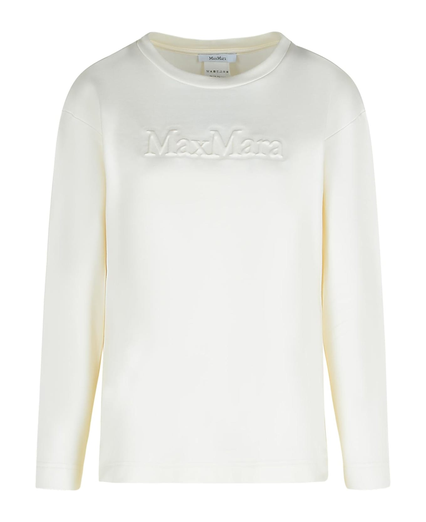 Silk and cotton sweatshirt, straight line, long sleeves with dropped shoulders, deep side slits, fleece lining, embossed front logo Composition: 55% silk, 43% cotton, 2% elastane Made in: Italy Color: White Model number: 2521926028600058001