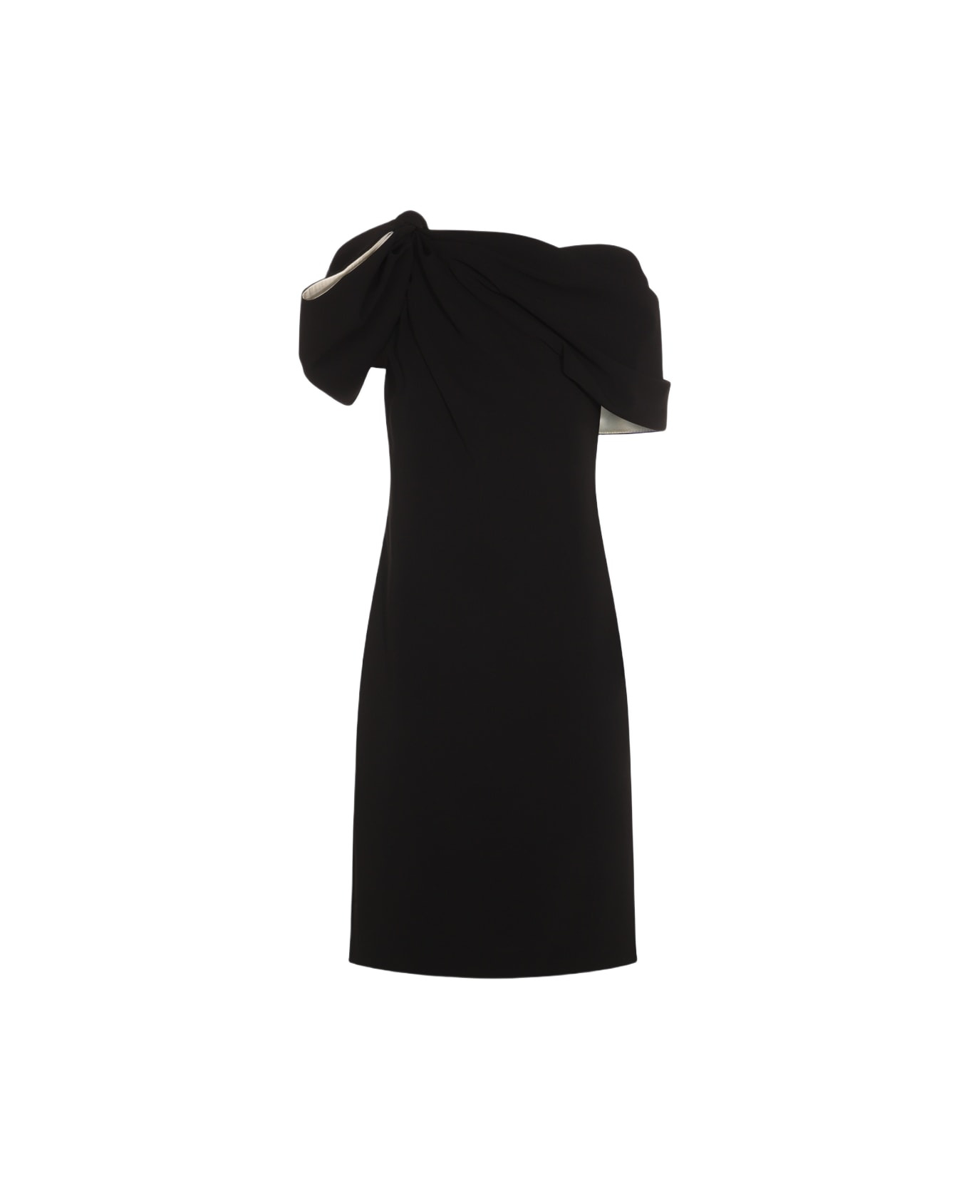 Black dress from Max Mara featuring asymmetrical collar, short sleeves, lateral zip fastening, bow detail and fitted vestibility. Composition: 65% Ta, 35% Polyester Made in: Italy Color: Black Model number: 252122605760010301004