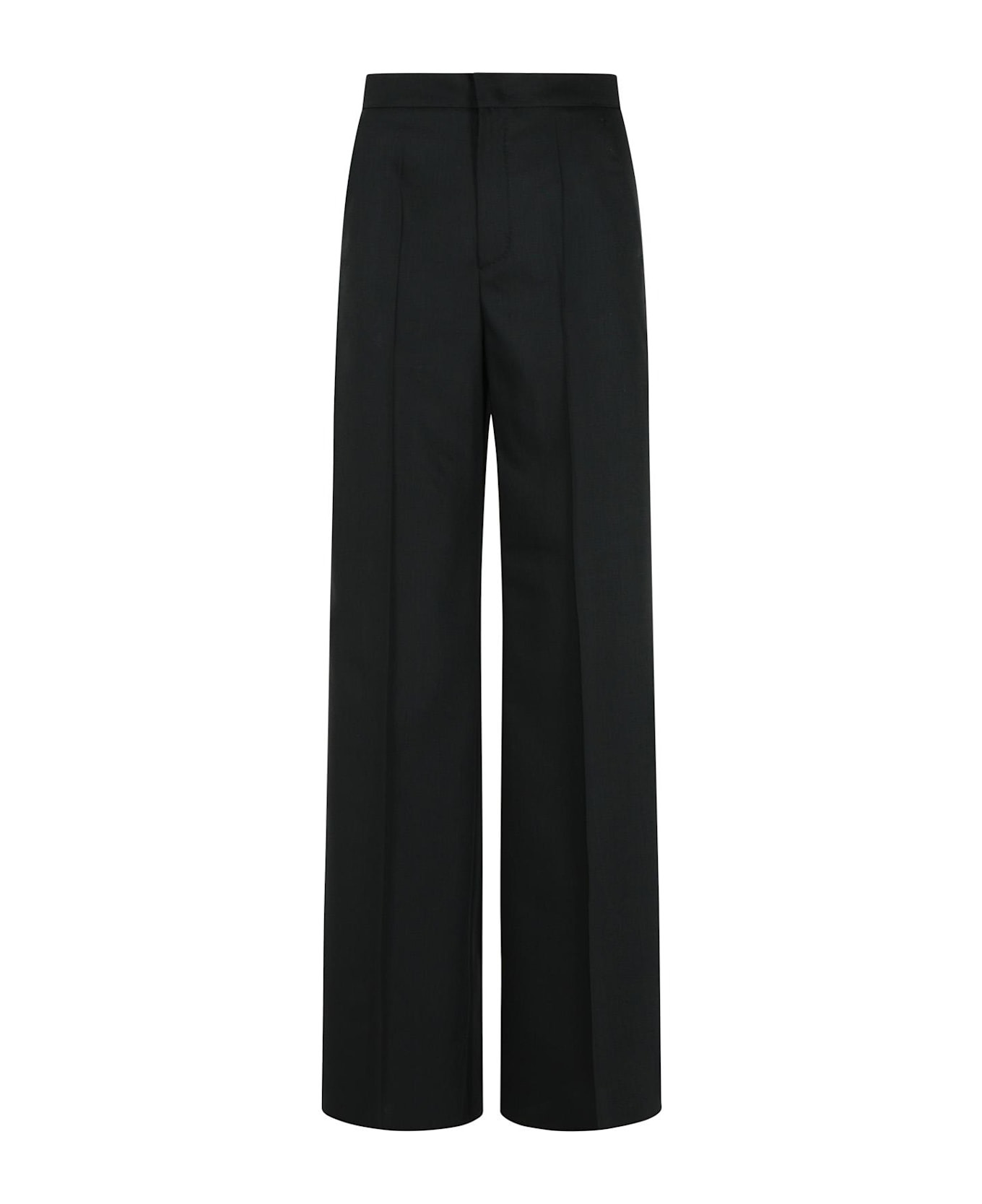 Light pure wool canvas trousers, loose fit, high waist strip closure, flap and hook zip, French pockets on the sides, tonal 'Max Mara' embroidery at the waist on the back, stretched pleat and sewn pin tucks at the waist on the back Composition: 100% virgin wool Made in: Italy Color: Black Model number: 21136121600004