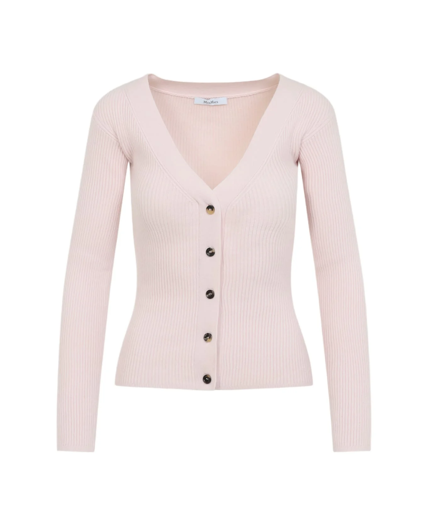 Max Mara Gioiosa Pink Wool Cardigan. Crafted from pink ribbed wool and cashmere, featuring a V-neckline, a front button fastening, long sleeves, a straight hem, and a slim fit. Made in: Italy Color: Rosa Model number: 2611361041600015