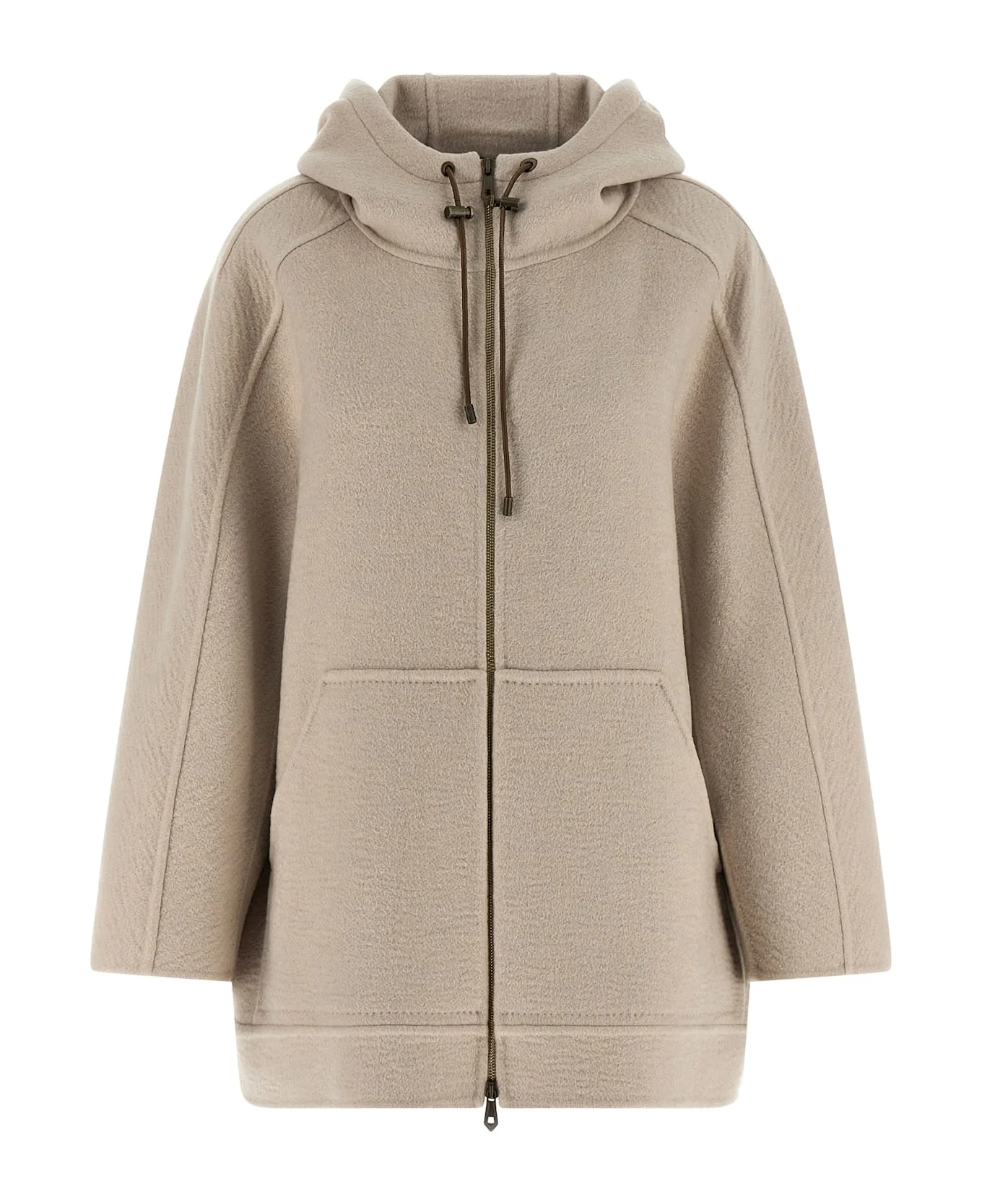 'Gradi' double hand-stitched coat of pure washed cashmere, fleece style, adjustable hood with leather drawstring, front zip closure, pockets, long wide sleeves with dropped shoulder, unlined. Composition: 100% cashmere Made in: Italy Color: Beige Size and fit: - Cocoon fit Model number: 2521086035600001