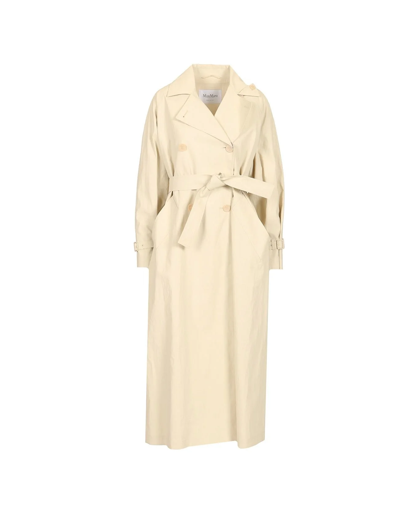 'Ronco' double-breasted long trench coat by Max Mara in linen canvas, with pleat motif sewn on the back at the waist. Lapel collar, raglan sleeves with toggles on the cuffs, welt pockets on the sides and matching belt. Composition: 100% Flaxlinen Made in: Italy Color: BEIGE Model number: 2511021123600720001