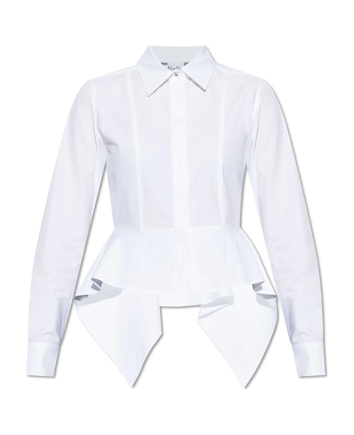Experience refined sophistication with the Gamma Shirt by Max Mara. Impeccably tailored, this white shirt features a classically fitted upper with an elegant collar, seamlessly contrasted by a striking asymmetrical peplum hem. Distinctive geometric, elongated panels and irregular finishing in the back create a sculptural silhouette, while pronounced vertical topstitching on the front visually elongates the figure. Crafted from a dignified, structured fabric a premium cotton blend the shirt offers both a matte, smooth surface and a touch of stretch for comfortable movement. Discreet, concealed button fastenings preserve its minimalist purity, elevated by a subtle silver logo detail beneath the collar, underscoring its exclusivity. This singular piece captures Max Mara's celebrated Italian craftsmanship and timeless design ethos. Why choose this product? Innovative, architectural silhouette for elevated style Luxurious high-quality materials for lasting comfort Exclusive silver logo detail for a signature finish Expert tailoring by the renowned house of Max Mara Composition: 97% Cotton 3% Elastane Made in: European Union Color: 0 Bianco Model number: 2521116011600001