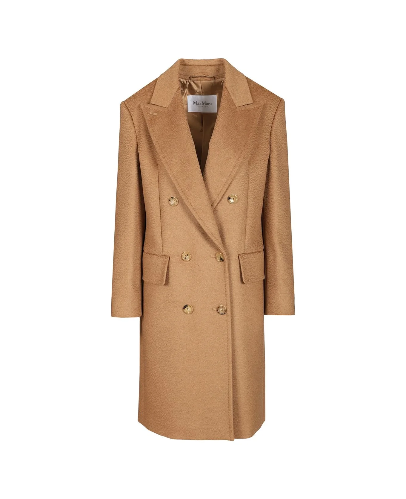 'Olimpia' coat in heavy pure sable camel drap by Max Mara, with a straight fit with slightly structured shoulders, peak lapels and set-in sleeves with buttons at the bottom, double-breasted fastening with 6 buttons, flap pockets on the front, finished with a tailored stitch and lined Composition: 100% Camelwool Camelus dromedarius Mongolia Made in: Italy Color: BEIGE Model number: 2521016012600562001