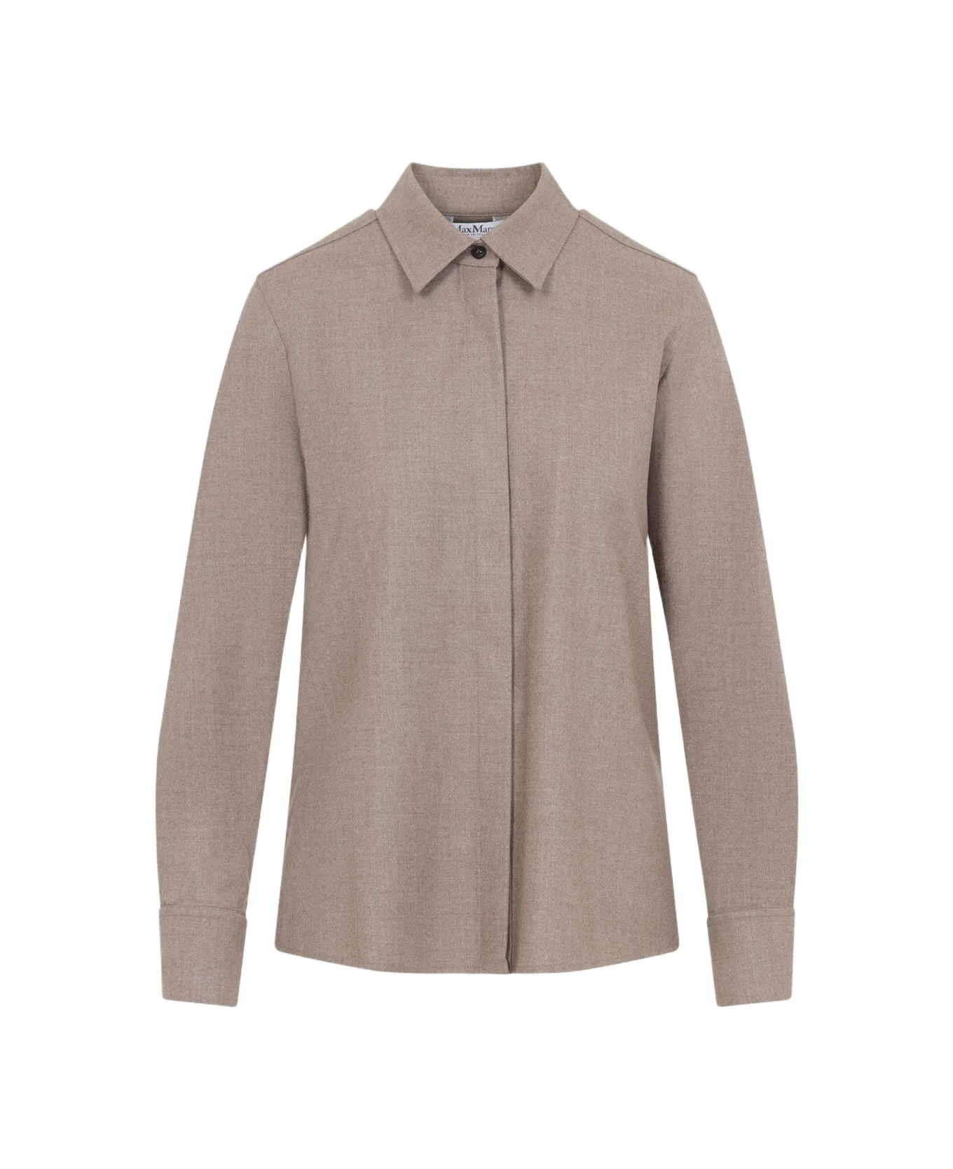 Max Mara Dark Cacha Brown Cashmere Tebaide Foule Shirt. Crafted in cashmere and elastane blend. Pointed collar, front concealing buttoned fastening, long sleeves, buttoned cuffs, straight hem. Made in: Italy Color: DOVE Model number: 2521116042600257002