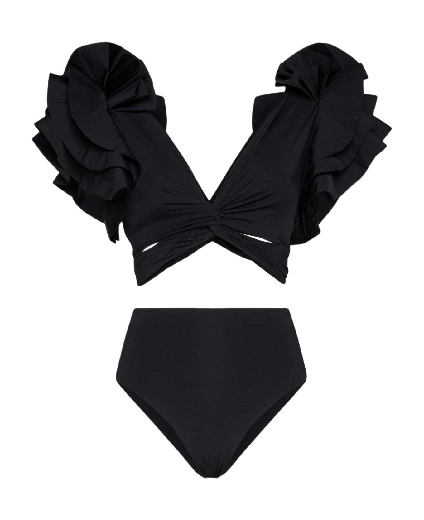Maygel Coronels Kai black jersey bikini featuring a Vneck top with 3D decorative ruffles, knotted bands on the front and back and highwaisted briefs. Composition: 78% polyamide 22% elastane Composition: 78% Polyamide -, 22% Elastane Made in: Extra European Union Color: Black Size and fit: - Model is 178 cm tall - one size Model number: BK032BLK