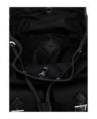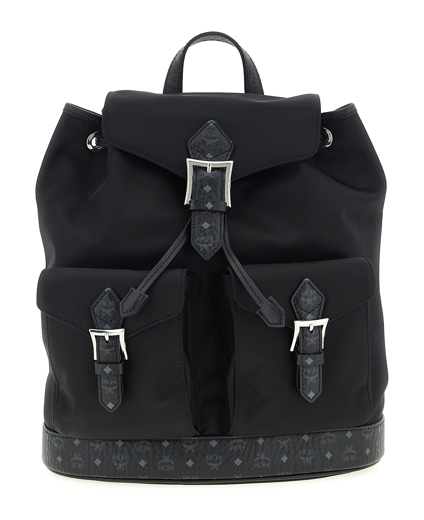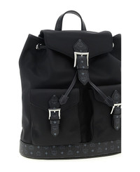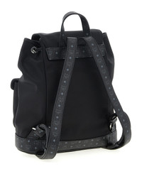 ECONYL® 'Aren' small nylon backpack with Visetos monogram leather trim, fixed handle, magnetic flap closure and inner drawstring, front pockets, adjustable shoulder straps. SUSTAINABLE: This product is made of ECONYL regenerated nylon. ® Composition: 100% nylon Made in: South Korea Color: Black Size and fit: - W 23 x H 25 x D 11 cm Model number: MWKFATA04BK