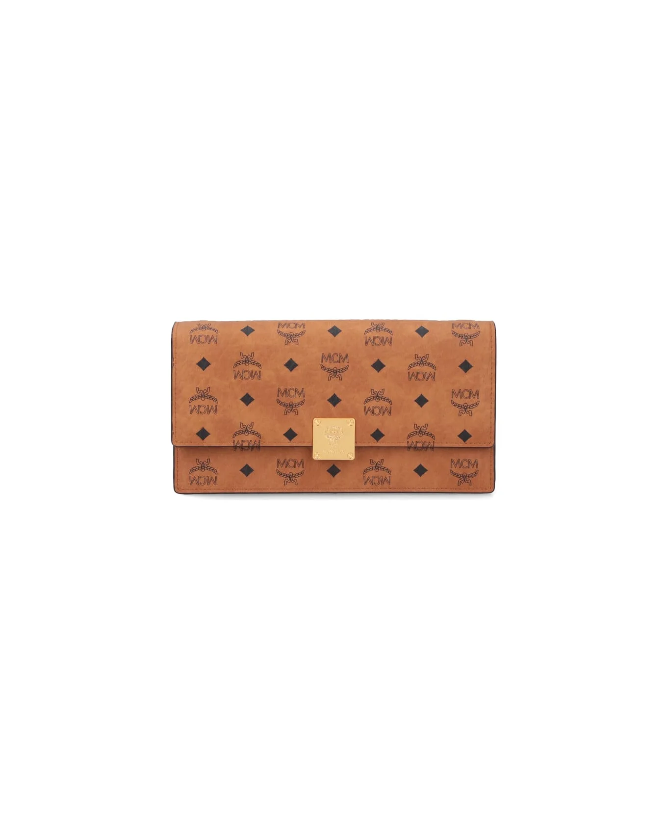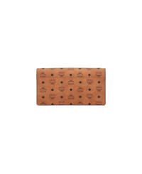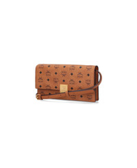 Large wallet with MCM logo shoulder strap, brown "Visetos", black logo print pattern, nappa trim, adjustable and removable shoulder strap, magnetic flap closure, gold metal logo tag on the front, inner flat pocket, inner zip coin pocket, main inner compartment. Composition: 63% Polyurethane, 20% Polyester, 17% Cotton Made in: South Korea Color: Brown Size and fit: - A 10 x L 19 x P 2.5 cm Model number: MYLFATA01CO