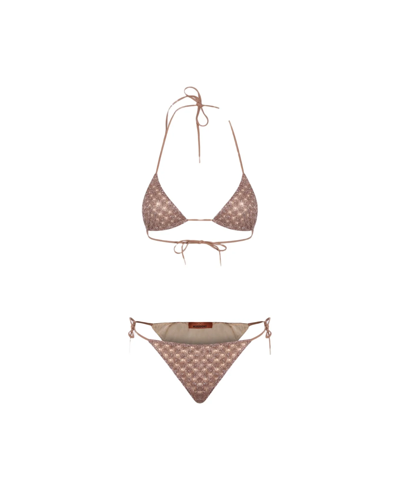 Lame' bikini set from Missoni featuring spiderweb motif, adjustable closure, and logo inserts. Composition: 87% Viscose, 13% Metallic Fiber Made in: Italy Color: Brown Model number: MC22SP00BR014DS80EE