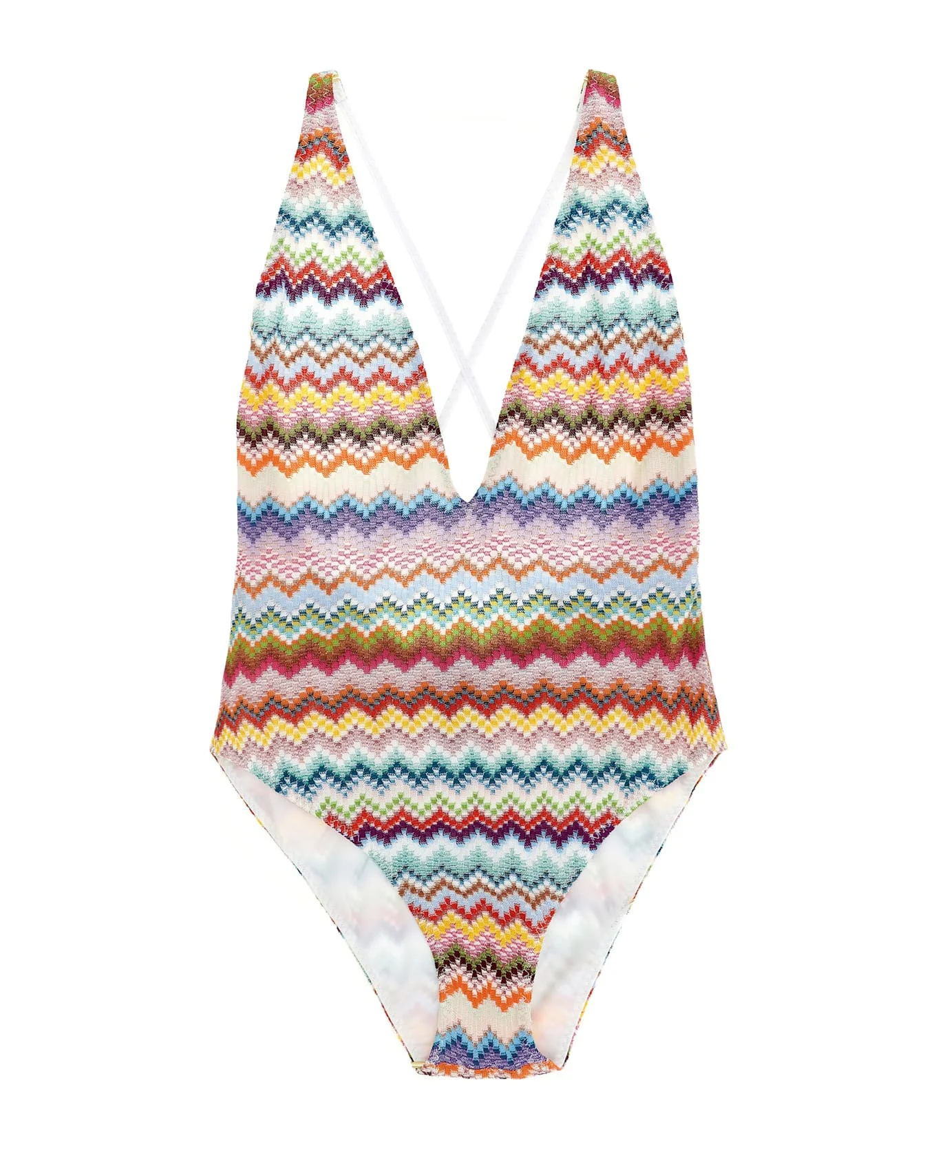 One-piece swimsuit in lamé viscose with pixel-effect zigzag pattern and V-neckline