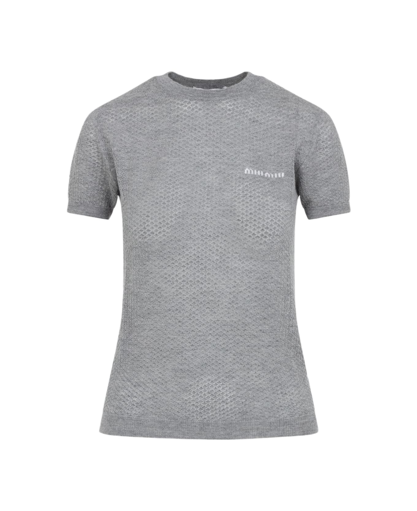 Miu Miu Grey Cashmere T-shirt. Crafted from texturized grey cashmere, round neckline, white contrasting logo inlay on the breast, short sleeves, straight hem, ribbed edges, slim fit. Made in: Italy Color: Grigio Model number: MMLB30SOOO17NNF0031
