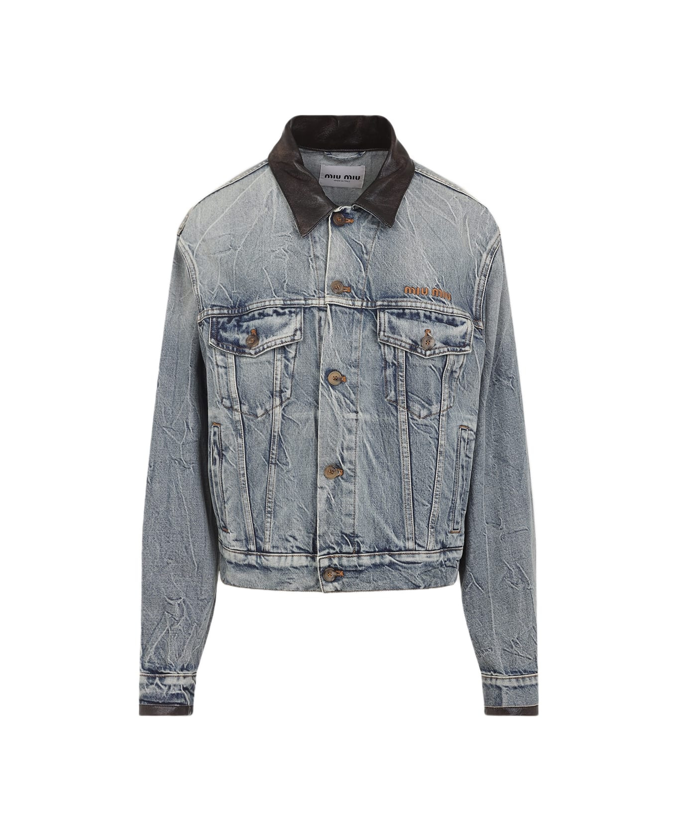 Miu Miu Light Blue Cotton Denim Jacket. Pure light blue cotton denim jacket. Pointed brown lamb leather collar, front buttoned fastening, chest brown embroidered logo, chest flap buttoned pockets, long sleeves, buttoned cuffs, straight hem. Overused and overwashed effect, contrasting stitching. Made in: Italy Color: Celeste Model number: GWB273SOOO175SF0076