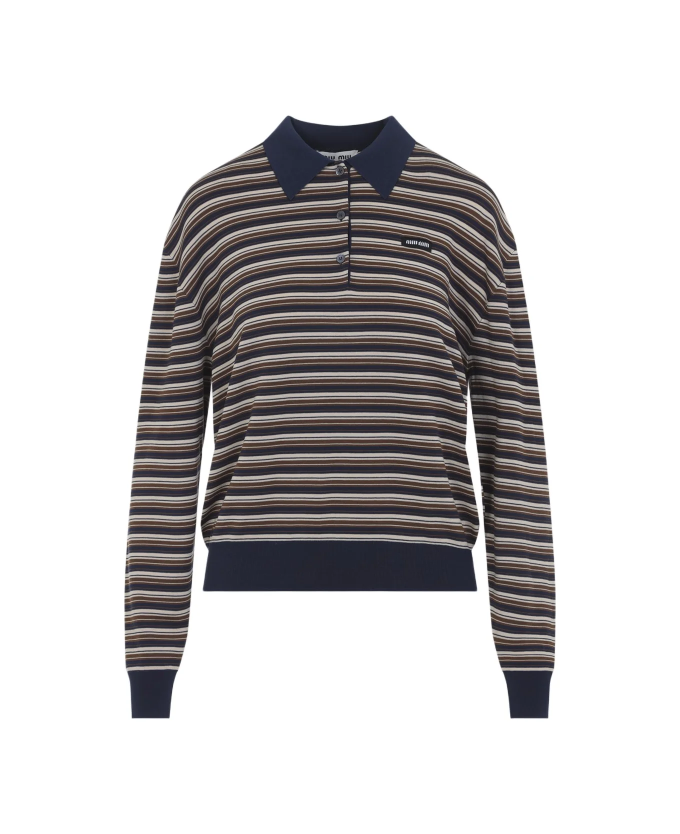 Miu Miu Albino Brown Cotton Polo. Pure cotton polo, pointed blue collar, classic polo collar, chest patch logo, dropped shoulders, long sleeves, blue ribbed cuffs and hem, straight hem. Beige, albino brown and blue stripes pattern. Made in: Italy Color: Albino Model number: MML03VSOOO1844F0627