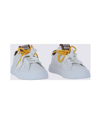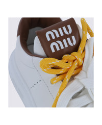 White leather sneakers from Miu Miu featuring round toe, laces fastening, logo details and leather sole. Composition: _cover, 100% Le Sole, 100% Elastodiene Made in: Italy Color: BIANCO+COGNAC Model number: 5E387EF0053L48F0TPR