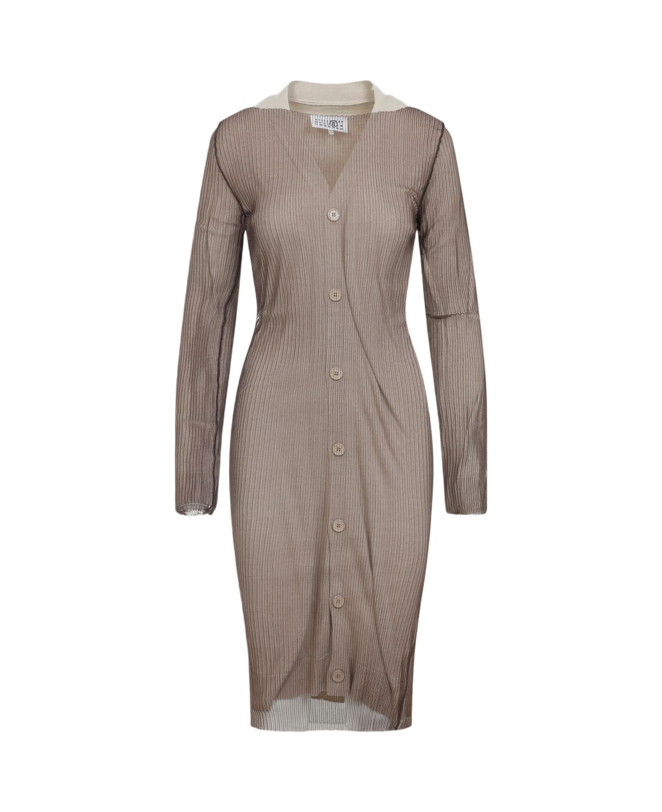 MM6 Maison Margiela Brown Virgin Wool Cardigan. Crafted in virgin wool and acrylic blend. V-neck, front buttoned fastening, long sleeves, knee-length, asymmetric hem, ribbed all-over, beige detail on the top. Made in: Romania Color: Beige Brown Model number: S62HP0033M13191961
