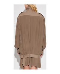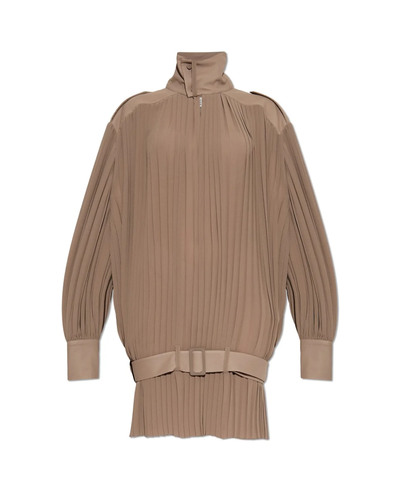Elevate your wardrobe with this pleated turtleneck dress from MM6 Maison Margiela an artisanal interpretation of contemporary style. Adorned in a rich chocolate brown, this short dress features a loose, oversize silhouette that skims above the knee, its fluid lines accentuated by wide sleeves with dramatic, buttoned cuffs. The entire piece is crafted from exquisitely pleated fabric, rendering a sense of depth and refined texture that captures the eye from every angle. A high, softly gathered collar and a delicate front slit frame the neckline, while a wide fabric belt, partially stitched and finished with a subtle back bow, defines the lower hips without compromising comfort. Unmistakably avant-garde, this dress encapsulates the conceptual artistry MM6 Maison Margiela imparts to every collection. Why choose this product? Impeccable pleats for texture and sophistication Relaxed, oversize tailoring ensures stylish comfort Avant-garde details true to MM6 Maison Margiela's bold vision Distinctive fabric belt accentuates silhouette with elegance Exclusive design inspired by contemporary artistic influences Composition: 100% Polyester Made in: Italy Color: Beige Model number: S62DD0046M35468805