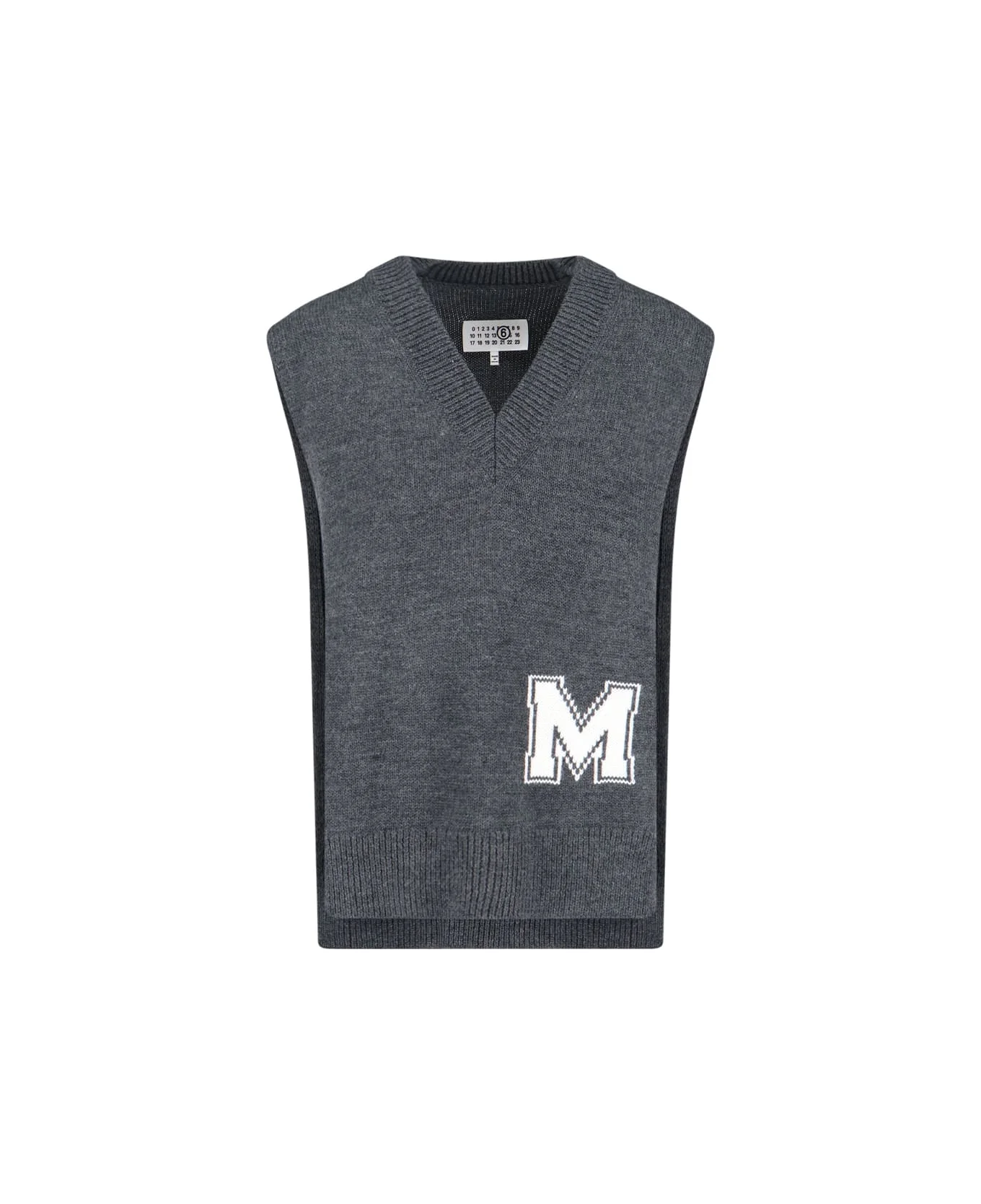 Maison Margiel MM6 V-neck sweater in grey virgin wool blend with contrasting intarate logo detail on the front, straight hem. Composition: 50% Virgin Wool, 50% Acrylic Made in: Italy Color: Gray Size and fit: - Vestibilita regolare Model number: S52TH0058M13206855M