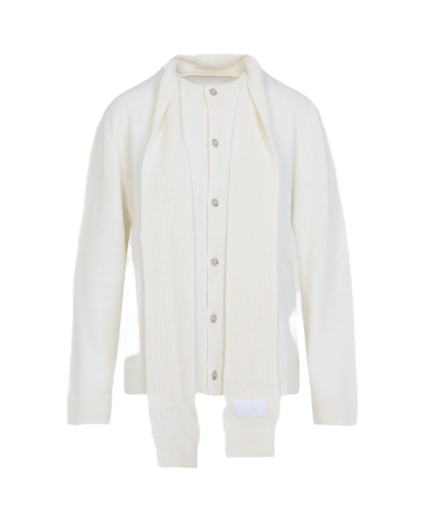 MM6 Maison Margiela White Wool Cardigan. Crafted from white virgin wool-blend, round neckline with integrated ribbed scarf, numeric signature label detail, front button fastening on the front, dropped shoulders, long sleeves, ribbed edges. Made in: Italy Color: Off White Model number: S52HP0034M13140101