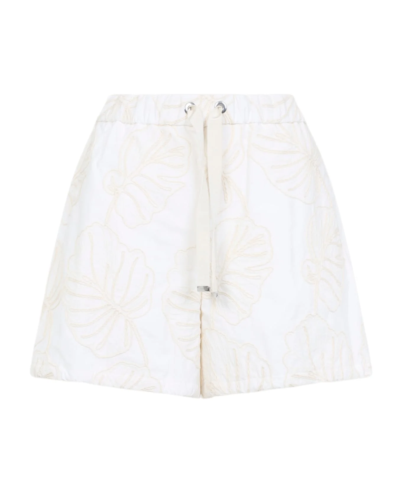 Moncler Light Beige Cotton Bermuda. Crafted from light beige cotton, featuring floral embroidery all over, an elastic waistband with drawstring, side pockets, and a straight hem. Made in: Hungary Color: Light Beige Model number: L10932B00010599ECF02
