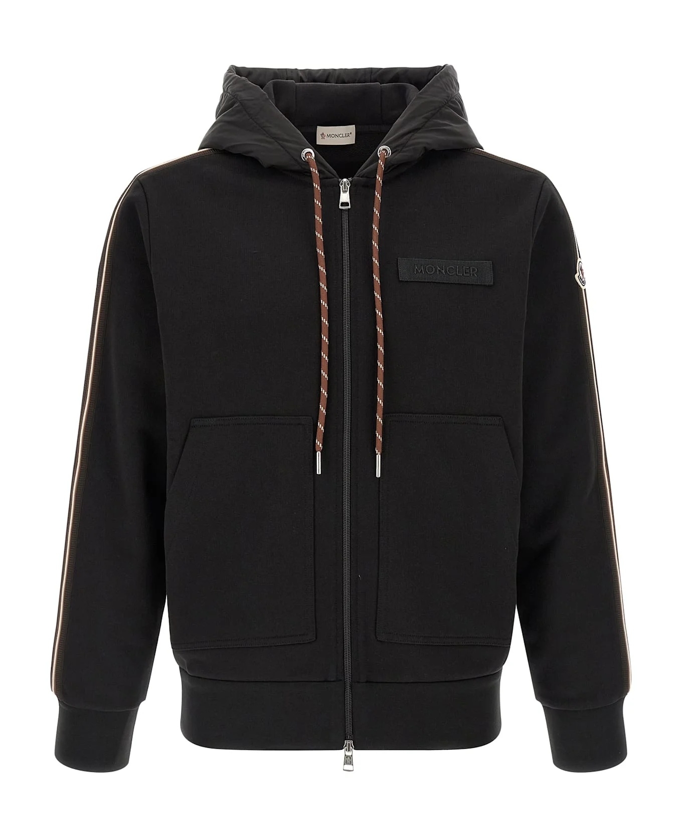 Brushed cotton sweatshirt, adjustable tone-on-tone nylon hood, tone-on-tone embroidered logo patch and front zip closure, pockets, long cuffed sleeves, tricolor finish and felt logo patch, headband. Composition: 100% polyamide Made in: Turkey Color: Black Size and fit: - true to size fit Model number: L10918G00042899V4999