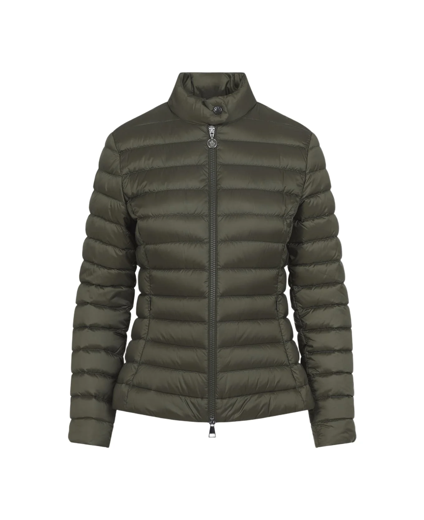 Moncler Igelle Green Polyamide Jacket. Down-filled jacket crafted from green tech fabric with satin finish, featuring a stand collar with snap button fastening, quilted pattern, front two-way zip fastening, side zip pockets, logo patch on the sleeves, and a full lining. Made in: Armenia Color: Olive Model number: L10931A00086597YF825