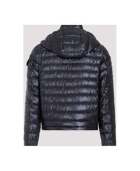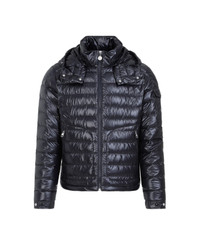 Moncler Navy Lauros Down Jacket. Pure navy polyester fabric, adjustable and removable hood, stand-up collar, front zipped fastening, lateral zipped pockets, long sleeves, buttoned cuffs, straight hem. Padded style, fully lined. Made in: Moldova Color: Navy Model number: L10911A00102595ZJ778