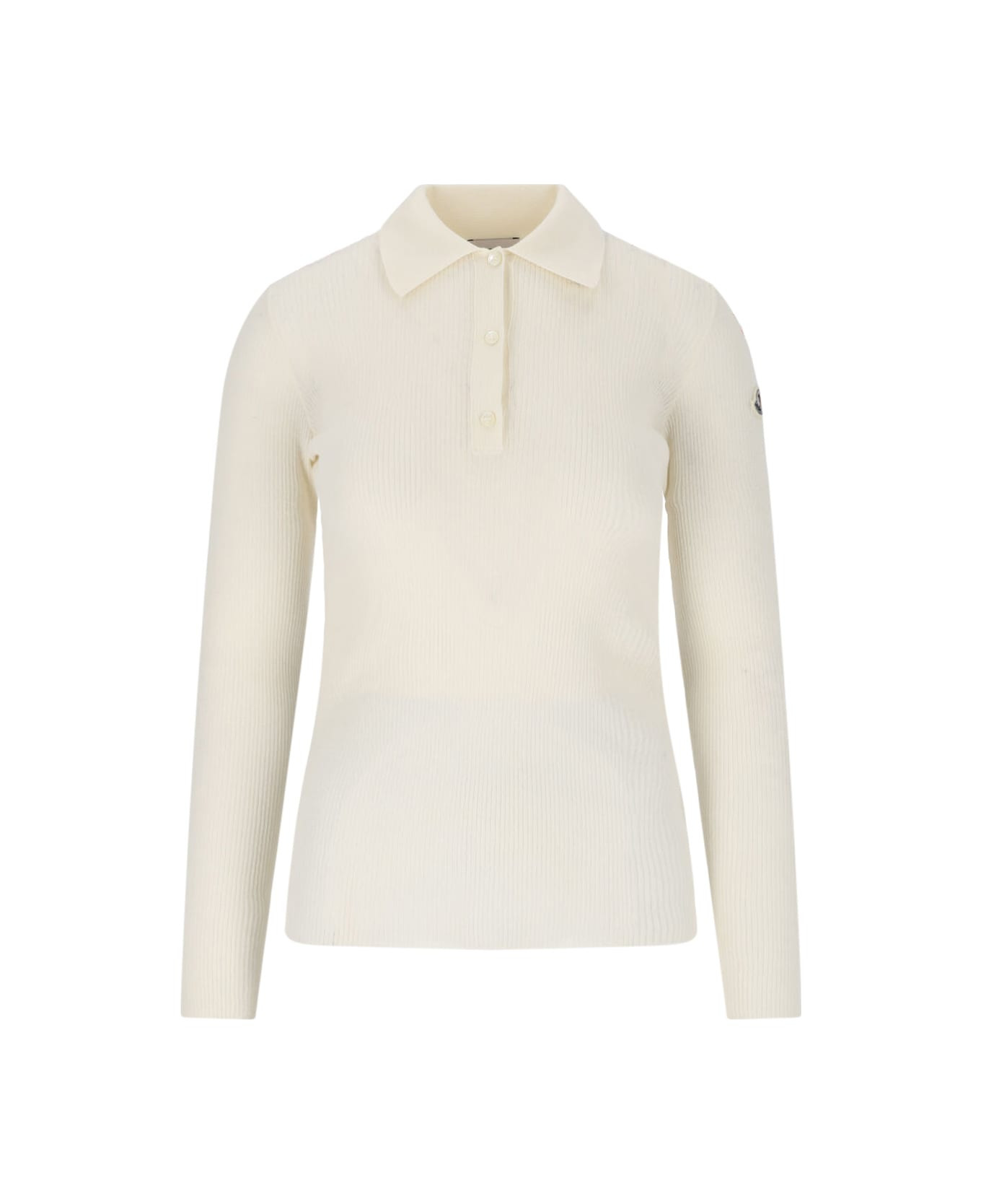Moncler logo ribbed top in cream cotton blend with ribbed pattern, classic collar, button closure, multicolor logo patch on the side, straight hem. Composition: 82% Cotton, 18% Polyamide Made in: Romania Color: Cream Size and fit: - vestibilita regolare Model number: 0939A000