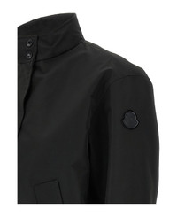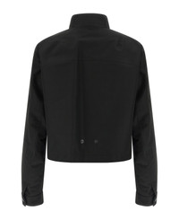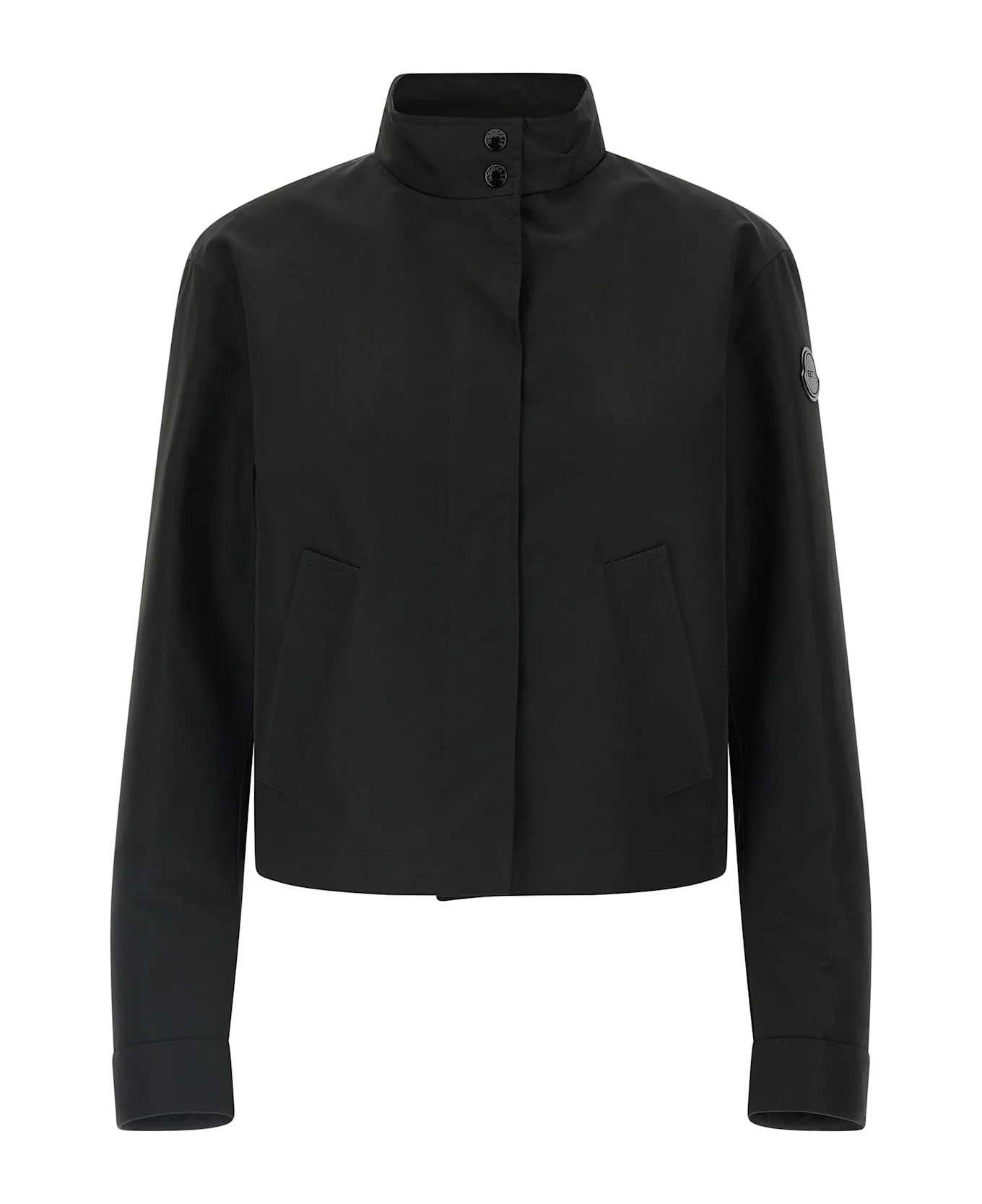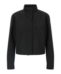 Moncler x Edward Enninful 'Krovanh' jacket in water-repellent technical fabric, quilted nylon lining and goose down padding, crop style, high neck, front snap button closure, pockets, long cuffed sleeves and tone-on-tone logo patch applique, and adjustable back strap with snap buttons. Composition: 100% polyester Made in: Romania Color: BLACK Size and fit: - true to size fit Model number: M65181A00005