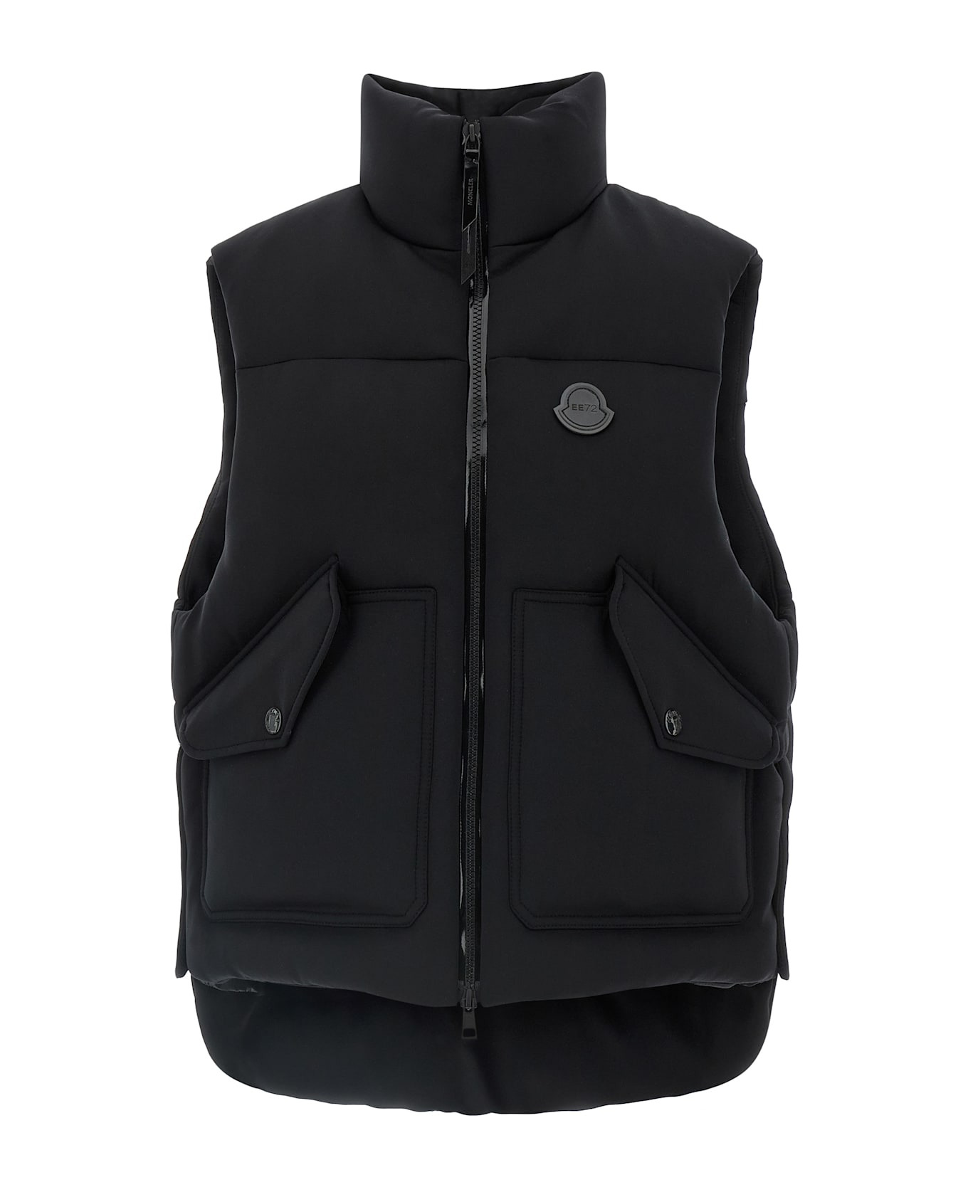 Moncler x Edward Enninful 'Otis' vest in quilted hand-peach cotton blend, nylon lining with goose down padding, high neck, tone-on-tone logo patch and front zip closure, pockets, drawstring at asymmetrical hem, side slits with snap buttons. Composition: 42% polyamide 33% cotton 25% elastane Made in: Romania Color: Black Size and fit: - true to size fit Model number: K24031A00003M6515999