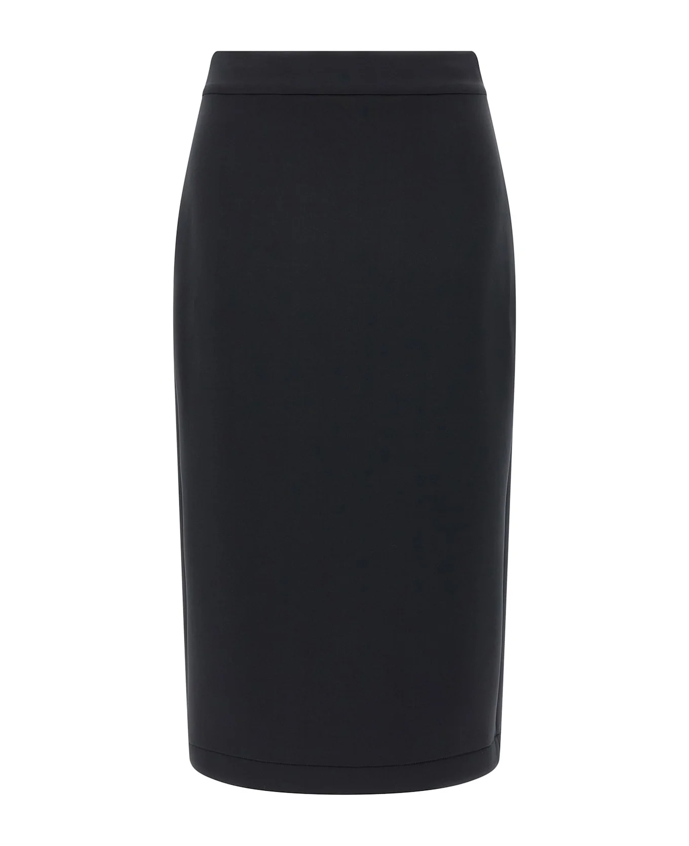 Moncler x Edward Enninful midi skirt in unlined scuba-effect fabric with longuette model, tone-on-tone logo patch, split and back pince, and side zip closure. Composition: 87% polyester, 13% elastane Made in: Italy Color: Black Size and fit: - true to size fit Model number: K24038H0000189A8K999