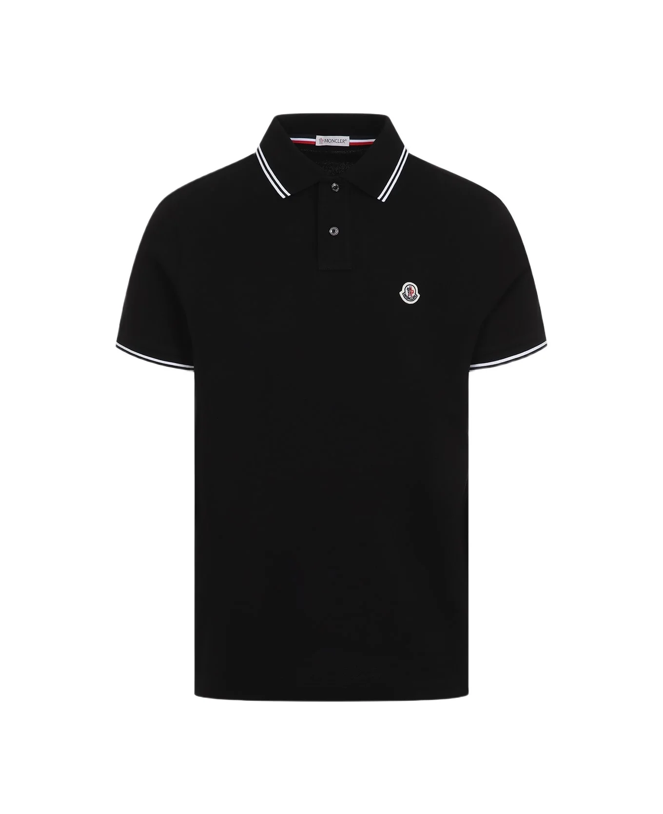 Moncler Black Cotton Short Sleeves Polo. Pure black cotton polo, classic polo collar, chest patch logo, short sleeves, straight hem, tonal stitching. White stripes details on the collar and on the trims. Made in: Turkey Color: Black Model number: L10918A0002784556999