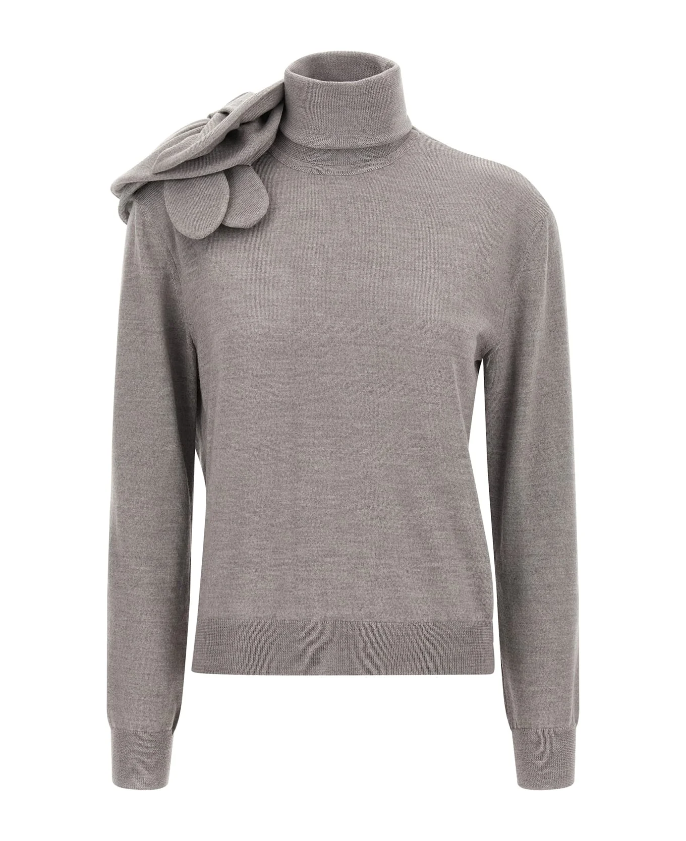 Extra-fine merino wool sweater, 3D flower-effect decoration on the shoulder, turned-up high neck, long cuffed sleeves. Composition: 100% virgin wool Made in: Italy Color: Gray Size and fit: - true to size fit Model number: A090354010486