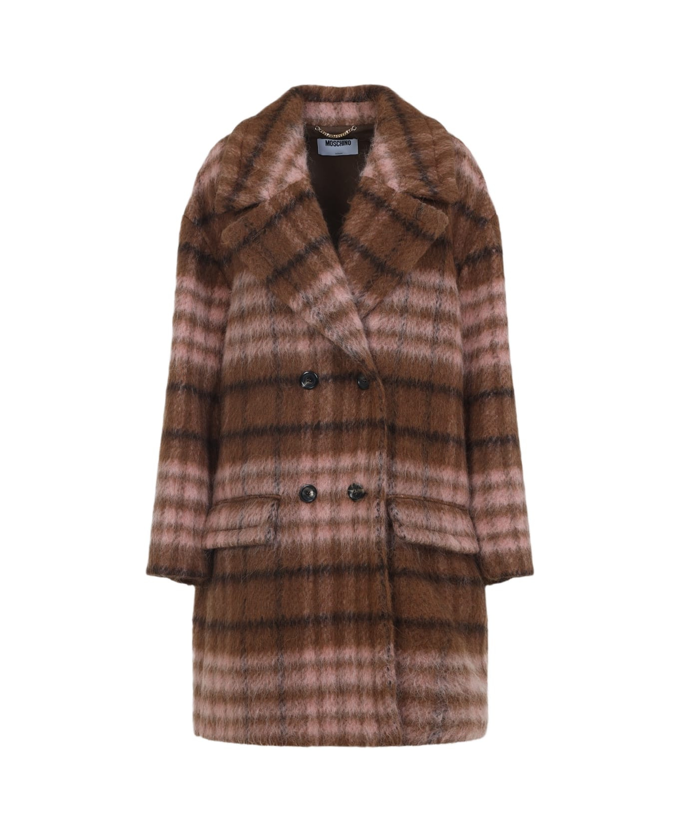 Moschino Brown Check Coat. Crafted in polyacrylic, polyester, wool and alpaca. Notched collar, front buttoned fastening, double-breasted design, side flap pockets, long sleeves, buttoned cuffs, straight hem, fully lining. Dark brown and light brown checked pattern all-over. Made in: Italy Color: Fantasia Marrone Model number: 252EA060455131096