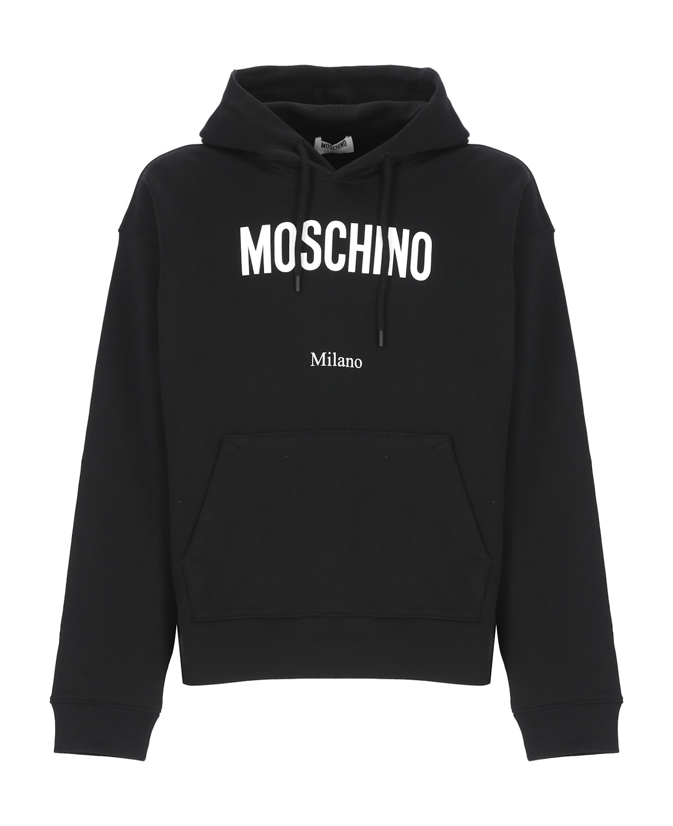 - Black Moschino cotton hoodie for man - Hood with drawstrings - Long sleeves - Front contrasting color printed logo - One front kangaroo pocket Composition: 100% Cotton Made in: Portugal Color: BLACK Model number: 5228A1708